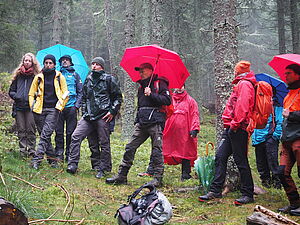 Am Donnerstagmorgen begrüßte Revierleiter Wilhelm Himmelbauer die Gruppe im Forstbetrieb Reichenfels im oberen Lavanttal. Bei strömenden Regen und bester Laune diskutierte man über das „Chaos mit System“ und die Forstbetriebsplanung, die sich auf eine permanente Stichprobeninventur mit fixen Probekreisen stützt. Herr Himmelbauer erläuterte die K-Wertmethode, über die er die Fichtenjungbestände auszeichnet, oder besser gesagt, „auszeigt“. Dabei diente ihm der Bitterlichstab, um in Abhängigkeit des Durchmessers den Konkurrenzdruck der Z-Baum-Bedränger zu beurteilen. Gegen Mittag lud dann die Familie Rittler auf ihr Gut Lichtengraben ein, stellte das Schloss und dessen Geschichte vor und servierte frisch geräucherte Forelle. Über das Klippitzthörl führte die Route weiter nach Hüttenberg im Görtschitztal, dem Geburtsort des Bergsteigers Heinrich Harrer. Mit dem Besuch des ihm gewidmeten Museums kam so auch das Kulturelle nicht zu kurz. Hoch hinaus führte für einige Mutige anschließend noch der Lingkor, ein tibetischer Pilgerpfad in der Felswand gegenüber des Museums. Nach der Rückfahrt ins Hotel ließ man den Abend bei gutem Essen und dem einen oder anderen Glas Rotwein ausklingen.