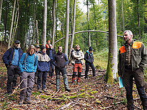Er vertrat die mittlerweile 4. Generation des Familienbesitzes. Die Bestände aus Fichte, Tanne und Buche sowie weiterer Begleitbaumarten zeigte eindrücklich, wie naturnahe Waldbewirtschaftung und biologische Automation Hand in Hand gehen können. Schneebrüche und Windwürfe waren immer wieder Ausgangspunkte für Naturverjüngung und einer daraus folgenden vertikalen Differenzierung und Strukturierung. Unter einer dazukommenden bestandesschonenden Einzelstammentnahme entwickelte sich ein Waldbild, welches sicher eines der Höhepunkte der Exkursion war.