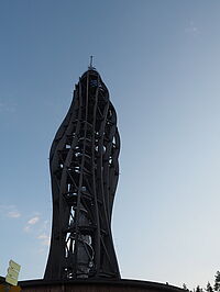 Es folgte eine Besichtigung des höchsten Holzturms der Welt. Mit 100m Höhe thront der Pyramidenkogel über dem Keutschacher Seental und dem Wörthersee. Im Genuss einer atemberaubenden Aussicht und bei schönem, jedoch windigem Wetter konnte die Gruppe in einer exklusiven Führung mit dem Architekten alles über die Entstehung und Bauweise aus Holz erfahren. Der Weg hinauf war steil und so bot es sich für einige Mutige an, den deutlich schnelleren Weg hinab zu wählen. In der höchsten Rutsche Europas, die in den Turm gebaut ist, konnte man innerhalb weniger Sekunden wieder den Erdboden erreichen.