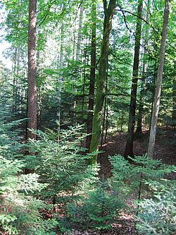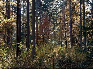 In den Jahrzehnten der Überführung hat der Anteil der Baumarten Fichte und Kiefer abgenommen und der von Tanne und Laubholz (Eiche, Buche und Hainbuche sowie Birke und Aspe auf den Kalamitätsflächen) zugenommen.