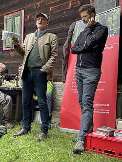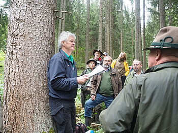 Wäldern kommt eine große Bedeutung bei der Bekämpfung des Klimawandels zu, da sie in der Lage sind Kohlenstoffdioxid (CO2) zu binden. Wie diese potenzielle CO2-Senke optimal und nachhaltig genutzt werden kann, ist momentan eine Leitfrage im forstwissenschaftlichen Diskurs. Inzwischen wächst auch die Bereitschaft privatwirtschaftlicher Unternehmen beständig, freiwillig für CO2-Kompensation zu bezahlen, um sich solche Klimaleistungen zertifizieren zu lassen. Ein Konzept, diese Nachfrage in Zusammenarbeit mit österreichischen Waldbesitzern zu bedienen wurde im Rahmen der Exkursion vom Start-Up „Tree.ly“ aus Vorarlberg vorgestellt. Auf der Grundlage eines berechneten Modellvorrates nach Ertragstafeln werden für den Waldbesitzer Zertifikate zur CO2-Kompensation durch ihren Wald an interessierte Unternehmen verkauft. Nicht unkritisch wurde am Forsthaus über die Gefahr des Greenwashings, aber auch über die hohe forstpolitische Relevanz dieser innovativen Idee diskutiert. So wies der Geschäftsführer des Forstvereins DI Martin Höbarth dezidiert darauf hin, dass die Gesellschaft bei der Reduktion von CO2 auf Landökosysteme – insbesondere Wald – angewiesen sind. Diese Notwendigkeit zusätzliches CO2 einzulagern, müsse als Klimaschutzleistung durch die Gesellschaft honoriert werden.