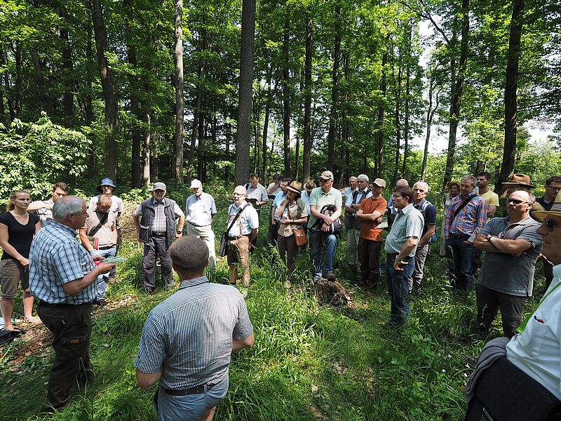Eine der Exkursionen war wiederum besonders auf unseren Interessentenkreis abgestimmt worden. Unter dem Titel „Multifunkionalität als Betriebsziel“ wurden vom Landesforstdirektur von Wien DI Andreas Januskovecz und von DI Hannes Lutterschmidt (MA 49, Leiter des Forstamtes Wienerwald) spannende Themen im stadtnahen Wald gezeigt und diskutiert: Besuchserlenkungsstrategien im 200 ha großen mit 300.000 Besuchern im Jahr hochfrequentierten Grünraum im Südwesten Wiens, Aspekte der Verkehrssicherungspflicht bei markierten und ausgewiesenen Wanderwegen und bei einer Vielzahl von „wilden Pfaden“. In ganz Wien besteht für 800 km Wege Verkehrsicherungspflicht, die Deckungsbeiträge liegen bei minus 22,-€/fm für die technisch anspruchsvollen Sanierungsfällungen. Dies trifft auf 1/3 des Einschlags zu. Es werden keine Harvester eingesetzt, erfolgreiche Versuche mit Pferderückung kommen den Besuchererwartungen entgegen. - Ansätze der Überführung zun ungleichaltrigen Strukturen auch mit reicher Tannenverjüngung unter Eiche und Pflegemaßnahmen wurden gezeigt.