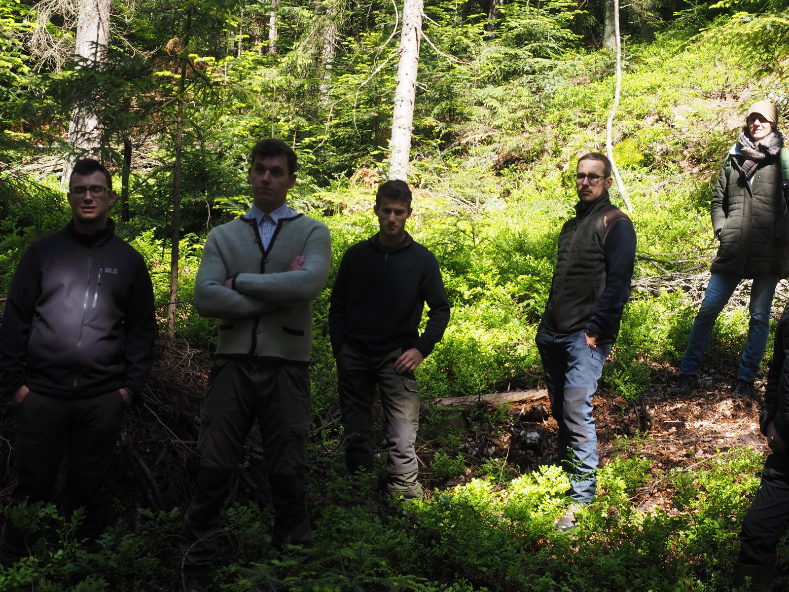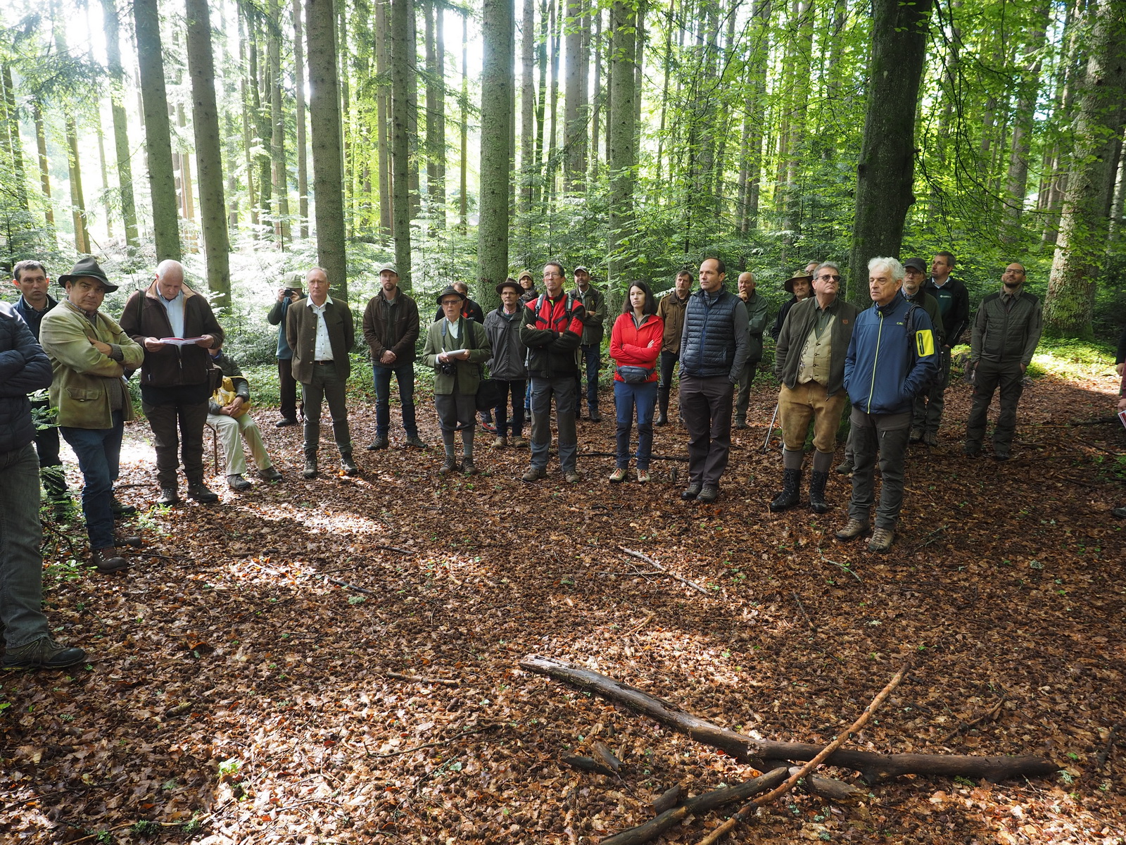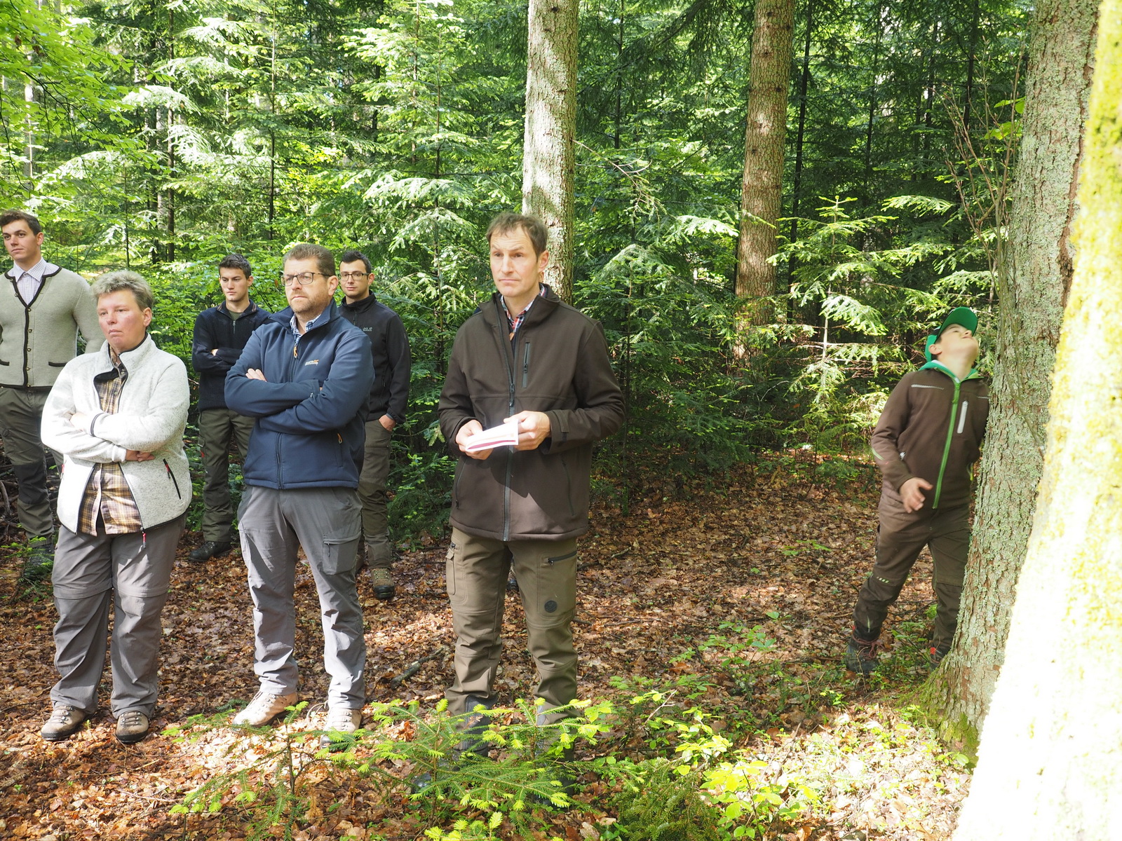 Die heutigen Zweischichtbestände zeigen vitale entwickelte Naturverjüngung aus Tanne. In Dickungen und Jungbestände diskutierten wir Läuterungen und Erstdurchforstungen, den Übergang von Auslese- zu Strukturdurchforstung. Eine Nullfläche mit Auszeige machte den Unterschied deutlich. Im Revierteil Sternberg wo ein Windwurf eine Schneise gerissen hatte, diskutierten wir Standorte und Waldgesellschaft, Kalamitätsrisken und Kalamitäten, Naturverjüngung und Wiederbewaldung, Wildschutz, und die weiteren Pflegemaßnahmen.