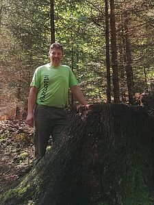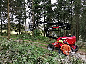 Den größten Teil der Holzernte und Pflegemaßnahmen führt der erfahrene Forstwirtschaftsmeister selbst durch. Durch sein Feinerschließungskonzept sind 80% der Waldfläche auf Kranreichweite mit Rückewegen erschlossen. Wenn er für Arbeitsspitzen dennoch Fremddienstleister beauftragt, markiert er auf den Rückegassen mit Pfeilen die erlaubten Fahrtrichtungen. Das wichtigste Kapital ist der Boden und diesen gilt es zu schützen. Wenn ein Pfeil an der Rückegasse nur nach unten zeigt, darf der Unternehmer nicht von unten nach oben fahren. - „Lieber drei Minuten länger einen Baum einschätzen als unnötige Schäden an der Naturverjüngung in Kauf nehmen.“