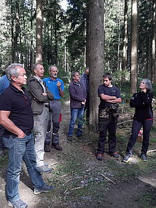 Um Wissen in den Wald zu bringen und die Grundbesitzer zu unterstützen, hat Stefan Heuberger sein aktuell veröffentlichtes Praxiswerk: „Faustzahlen für die Kleinwaldbewirtschaftung“ vorgestellt. Es wurde mit einfachsten Hilfsmitteln der Brusthöhen-Durchmesser, Baumhöhe, Einzelbaumvolumen, Bestandesvolumen und Zuwachs eines Bestandes bestimmt, woraus schlussendlich die nachhaltige Entnahmemenge ermittelt werden konnte. Diese spielte in weitere Folge eine Rolle für die praktische Auszeige in der Strukturdurchforstung und einzelstammweise Entnahme in der Zielstärkennutzung.