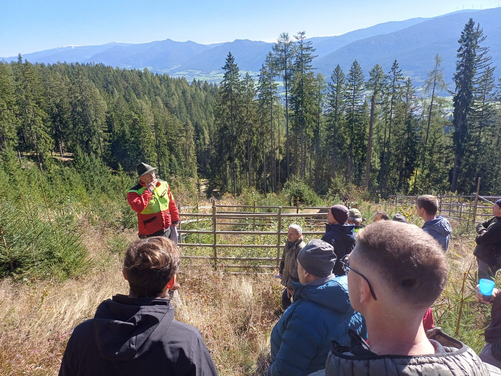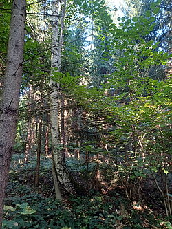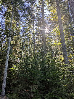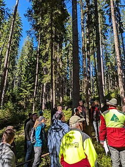 Der vierte und letzte Exkursionspunkt liegt südöstlich exponiert auf einer Seehöhe von etwa 900 Metern bei einer Hangneigung von rund 25 %. Der Bestand weist ein Alter zwischen 90 und 170 Jahren auf. mit einem Vorrat von rund 640 Vorratsfestmetern und einem Bestockungsgrad von 0,85. Die Baumartenzusammensetzung wird von der Fichte mit etwa 70 % dominiert, ergänzt durch 20 % Lärche und 10 % Weißkiefer. Vereinzelt treten Tanne und Rot-buche hinzu, was eine gewisse Strukturvielfalt schafft. Die Bewirtschaftung erfolgt seit 1996 nach dem Dauerwaldprinzip, das auf eine kontinuierliche Nutzung und die Entwicklung un-gleichaltriger Bestände abzielt. In diesem Zeitraum wurden drei Ernteeingriffe durchgeführt, wobei jeweils nur 10% des Vorrats entnommen wurde. Die Entnahme konzentrierte sich dabei auf wenig vitale Individuen in der vorherrschenden und herrschenden Schicht. Seit 2002 wurde kontinuierlich Weißtanne untergebaut. Auch das gezielte Belassen von stehendem und liegendem Totholz wird auf der Fläche forciert, um die Biodiversität und wichtige ökologische Funktionen zu fördern. Das langfristige Ziel ist die Entwicklung einer dauerwaldartigen Struk-tur, bei der ein Vorrat von etwa 600 Vorratsfestmetern pro Hektar erhalten bleibt. In der gemeinsamen Diskussion wurde erörtert, dass die Dauerwaldstrategie eine hohe Bestandesstabilität und Biodiversität begünstigt und das Risiko großflächiger Schadereignisse deutlich re-duziert. Die gezielte Förderung der Weißtanne ist sinnvoll, da sie als klimastabile Baumart gilt und die Anpassungsfähigkeit des Bestandes an zukünftige Bedingungen verbessert.