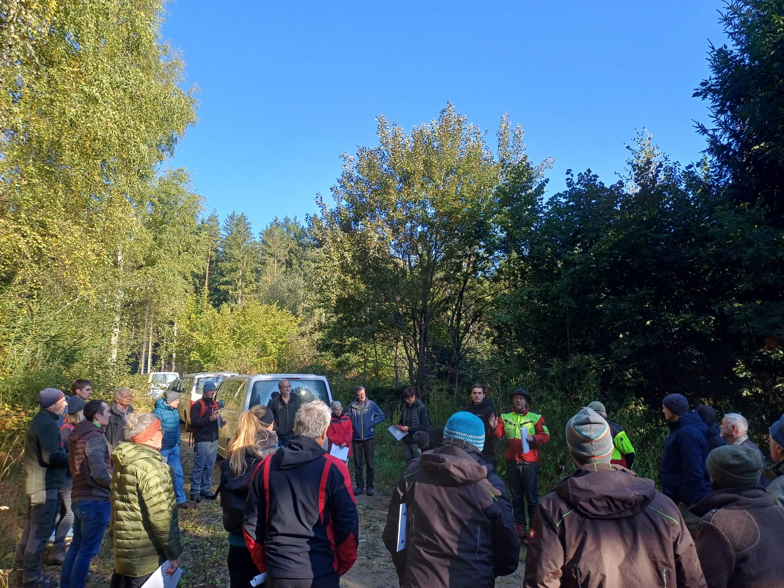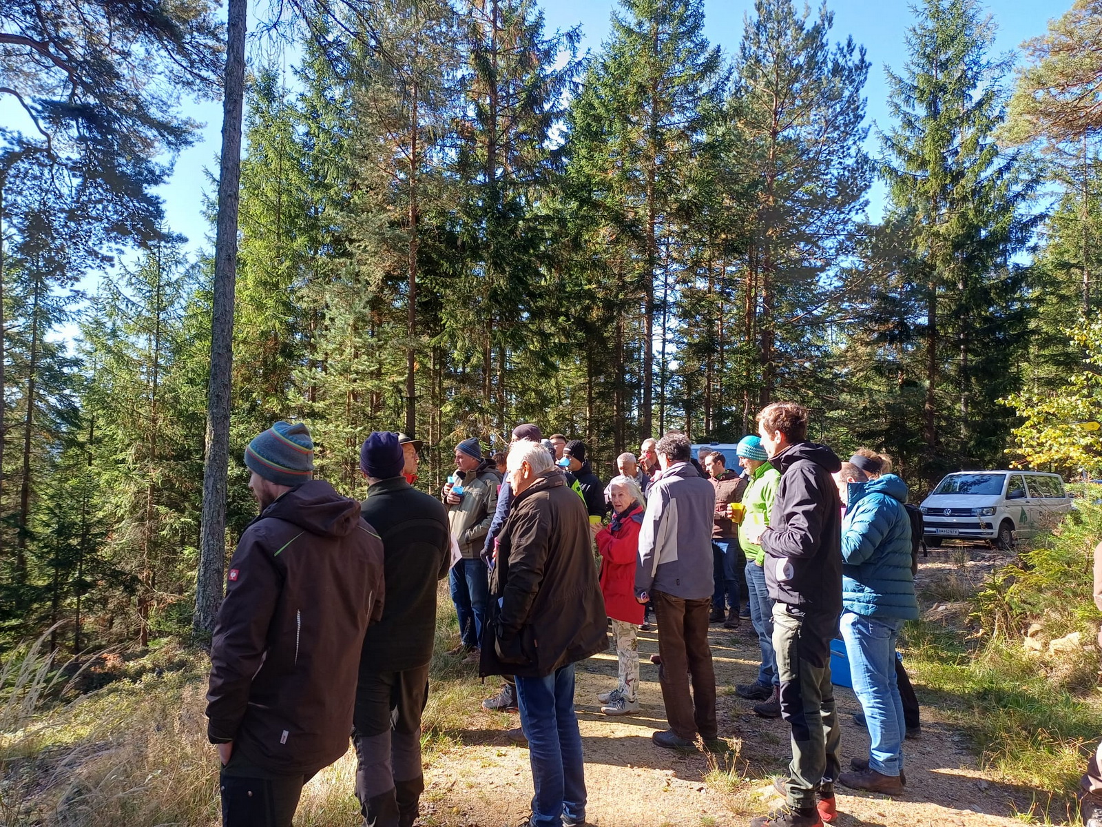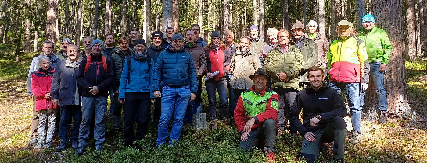 Bei traumhaften, herbstlichen Bedingungen nahmen 29 Teilnehmer an der diesjährigen steirischen Regionaltagung teil. Zu Beginn führten uns Martin Krondorfer (Leiter der Fast Pichl) und der zuständige Förster Andreas Jäger in einen Bestand im Alter von ca. 25 Jahren (Bestockungsgrad 0,9). Dieser befindet sich auf einer Seehöhe von rund 620 Metern bei einer Hangneigung von etwa 15 % und östlicher Exposition. Die Baumartenverteilung zeigt einen deutlichen Nadelholzschwerpunkt mit 60 % Fichte, ergänzt durch 30 % Bergahorn und 10 % Esche. Zusätzlich sind vereinzelt Douglasie, Roteiche, Kirsche, Schwarznuss, Birken sowie Hasel beigemischt, was die Baumartendiversität erhöht. Die natürliche Waldgesellschaft entspricht einem feuchten Bergahorn-Eschenwald, der für diesen Standort typisch ist. Die Bestandesentwicklung ist durch eine Altholzräumung im Winter 2000 geprägt, bei der ein Fichten-Lärchen-Bestand geerntet wurde. Anschließend erfolgte die Aufforstung mit Mischbaumarten, wobei Laubholz in Trupps (3–5 Bäume pro Trupp, Abstand 8–10 m) und Fichte (1,5 x 1,5 m) eingebracht wurden. Zur frühen Stabilisierung wurden zwei Läuterungen durchgeführt, die sich vor allem auf das Nadelholz konzentrierten. In der Gruppe wurde erörtert, dass die die Einbringung von Mischbaumarten einen positiven Beitrag zur Biodiversität und Bestandesstabilität brachte und die Anpassungsfähigkeit an zukünftige klimatische Veränderungen potenziell erhöht wurde. Allerdings ist der Pflegeaufwand aufgrund der unterschiedlichen Baumarten und Pflanzsysteme erheblich. Zudem bleibt der Konkurrenzdruck durch die Fichte bestehen, was eine kontinuierliche waldbauliche Steuerung erforderlich macht. Eine Überführung in dauerwaldartige Strukturen scheint aus derzeitiger Sicht in den nächsten 50 Jahren als realistisch.