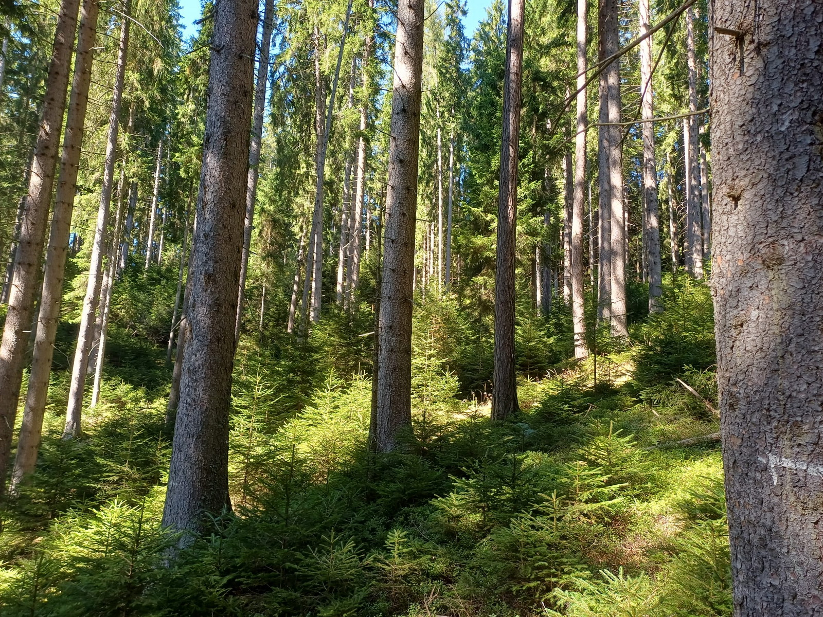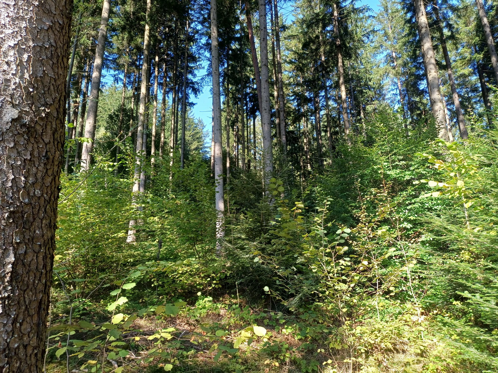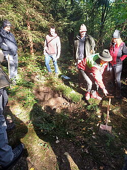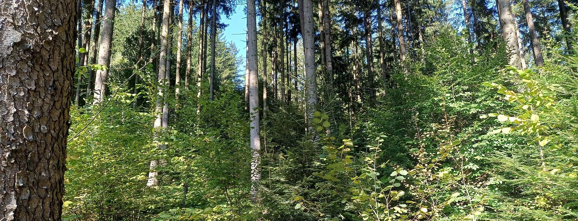 Der zweite Exkursionspunkt brachte uns auf einer Seehöhe von etwa 620 Metern bei einer Hangneigung von rund 25 % und ist östlich exponiert. Der Bestand weist ein Alter von 95 Jahren auf und stockt mit einem Vorrat von rund 650 Vfm bei einem Bestockungsgrad von 0,8. Die Baumartenzusammensetzung ist stark von der Fichte geprägt (95%). Ergänzend finden sich 5 % Lärche sowie vereinzelt Rotbuche, Weißkiefer und Zitterpappel. Die Naturverjüngung zeigt eine positive Entwicklung in Richtung Mischwald: Neben Fichte treten Tanne, Rotbuche, Birke und Roteiche auf. Diese Entwicklung wird durch waldbauliche Maßnahmen unterstützt. Durch wiederkehrende Niederdurchforstungen und Negativauslese konnte Naturverjüngung flächendeckend eingeleitet werden. Zusätzlich wurden Weißtanne und Rotbuche in Horsten eingebracht, um die Baumartenvielfalt zu erhöhen und die Durchmischung des Bestandes zu fördern. Es wurde festgehalten, dass der nach wie vor hohe und relativ instabile Fichtenanteil ein erhebliches Risiko darstellt, insbesondere im Hinblick auf Windwurf und Borkenkäferbefall. Die vorhandene Naturverjüngung sowie die gezielte Einbringung von Mischbaumarten sind jedoch vielversprechende Schritte hin zu einer stabileren und ökologisch wertvolleren Bestandesstruktur. Mit der stockenden Verjüngung können Dauerwaldstrukturen in den kommenden Jahrzenten angestrebt werden.