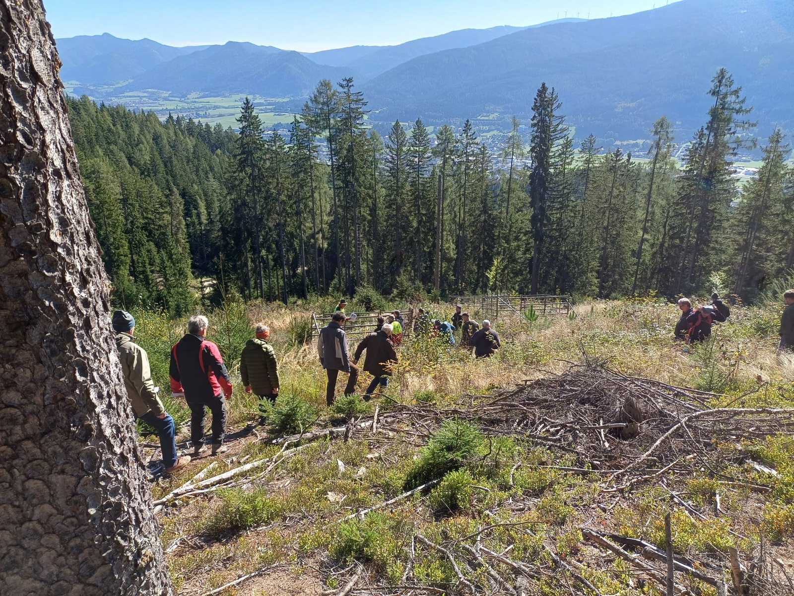 Der dritte Exkursionspunkt ist ein Südhang auf einer Seehöhe von rund 900 Metern bei einer ausgeprägten Hangneigung von etwa 40 %. Der Bestand im Jungwuchsstadium weist ein Alter von bis zu fünf Jahren auf. Die Baumartenzusammensetzung umfasst Fichte, Schwarzkiefer und Buche, ergänzt durch einzelne Tannen und Lärchen. Die Bestandesgeschichte ist durch ein gravierendes Schadereignis geprägt: Ab dem Jahr 2020 kam es zu einem großflächigen Absterben von Fichte und Lärche, voraussichtlich durch Aluminiumfreisetzung und anschließendem Feinwurzelsterben. Eine umfassende Aufforstung war erforderlich. Dabei wurden Buchen in Horsten, teils mit Kalkung, sowie Schwarzkiefern in Zellen eingebracht. Zusätzlich wurde Tanne eingebracht, um die zukünftige Bestandesstruktur zu stabilisieren. Eine Besonderheit dieser Fläche ist die Anlage von Versuchsparzellen zur Kalkung mit Magnesiumkalk (Mg30), um den Einfluss auf den Boden-pH-Wert und die Vegetationsentwicklung zu untersuchen. Die Entwicklung des Jungwuchses wird durch starken Hasenverbiss erheblich beeinträchtigt, wodurch die Höhenentwicklung der Buche nicht repräsentativ ist. In der gemeinsamen Bewertung der Fläche zeigte sich, dass die Kalkung leichte Unterschiede in der Vegetationszusammensetzung bewirkte, der Verbiss jedoch als limitierender Faktor die Erfolgsaussichten der Aufforstung deutlich einschränkt. Die Schwarzkiefer erweist sich als interessante Alternative zur Fichte, wobei die Herkunft sorgfältig gewählt werden muss, um eine standortgerechte Anpassung sicherzustellen.