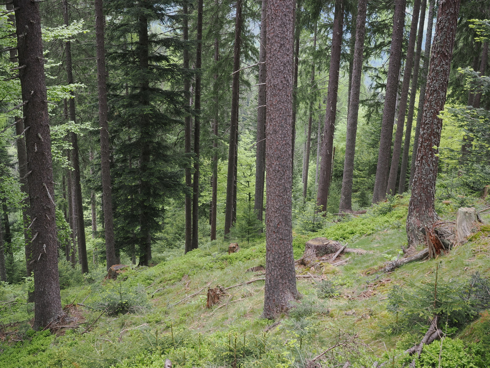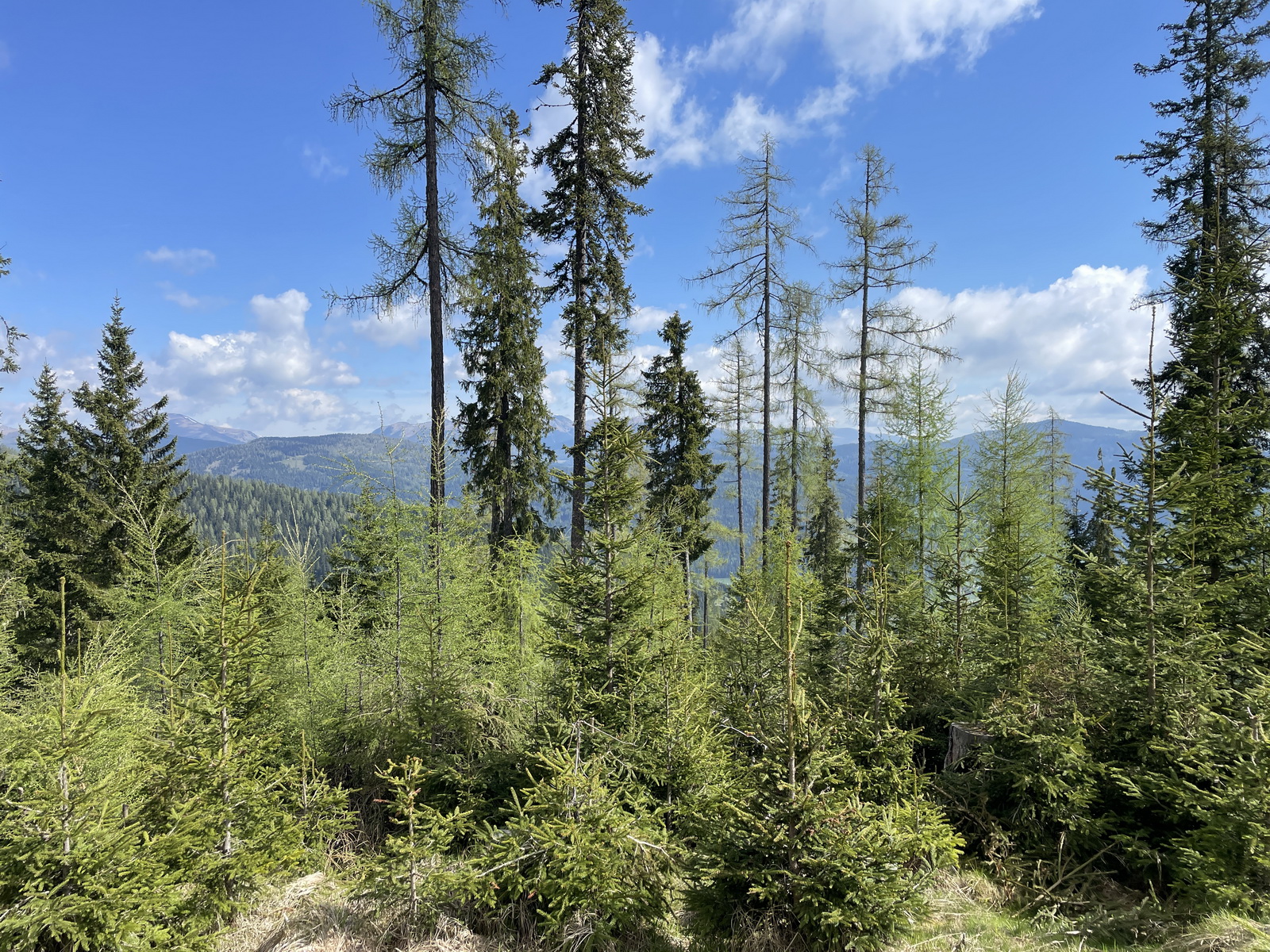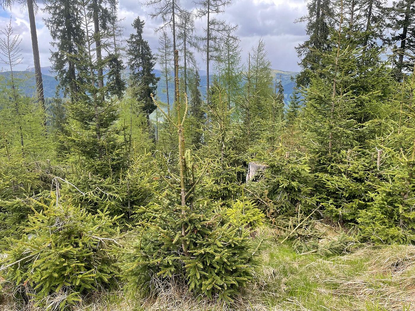 Diese Fichten werden dann bei der nächsten Läuterung (ca. 3 Jahre Abstand zwischen den Läuterungen) entnommen, erklärte Herr Carletto Lodron. Des Weiteren wurde bei dieser Läuterung darauf geachtet, dass eine Mehrschichtigkeit des Bestandes gefördert wird.