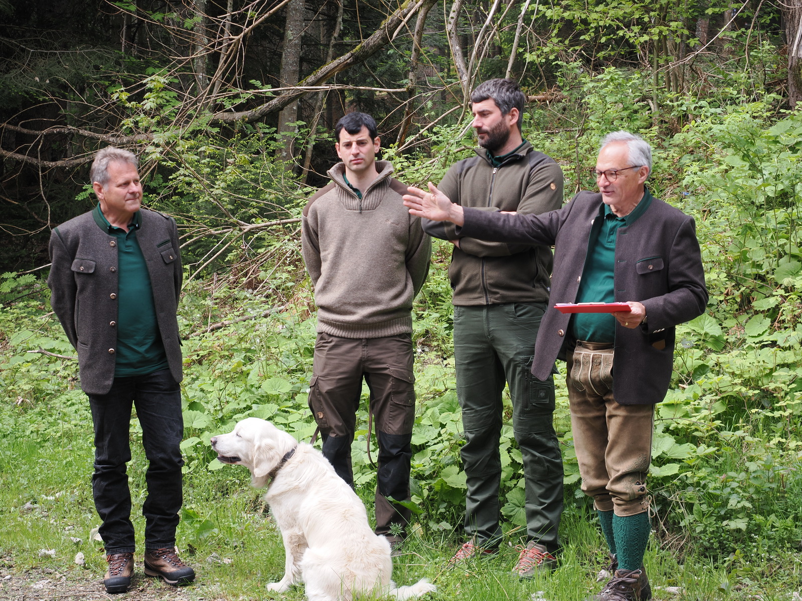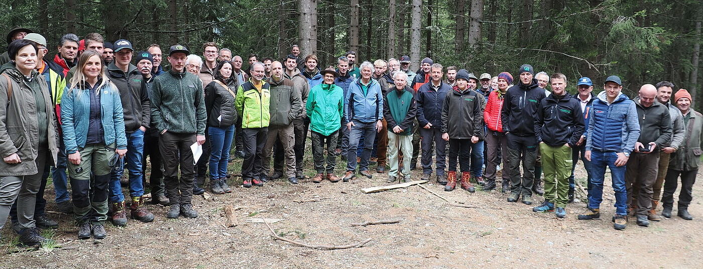 Zum Abschluss wurde noch ein Stangenholzbestand besichtigt, welcher stark vom Einfluss durch Rotwild in Form von Schälschäden gezeichnet war. Hierbei wurde von Herrn Stefan Schlitzer erläutert, wie sie mit solchen Beständen umgehen. Bei der Auszeige wird das Hauptaugenmerk auf die Qualität der einzelnen Individuen gelegt. Dies bedeutet das zuerst jene Individuen, welche keine Schäden aufweisen, als Z – Bäume markiert werden. Des Weiteren werden dann die Bedränger dieser Z - Bäume zur Entnahme gekennzeichnet. Bei dieser Durchforstung wird auch ein Teil der entnommenen Bäume mit der Motorsäge „zusammengeschnitten“ und im Bestand belassen, sodass dies eine natürliche Barriere gegen das Rotwild schafft, und so der Bestand vom Rotwild in Zukunft gemieden wird.