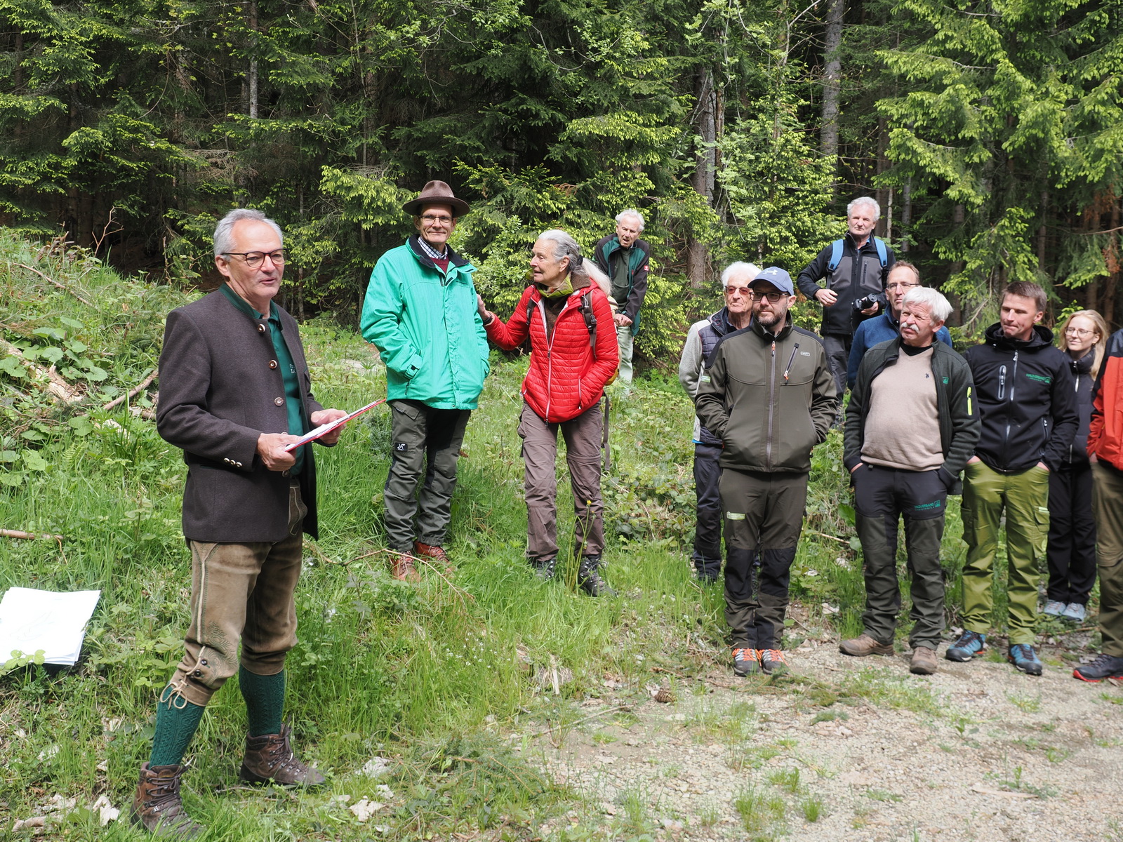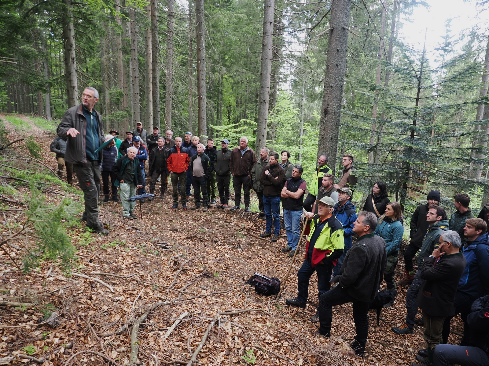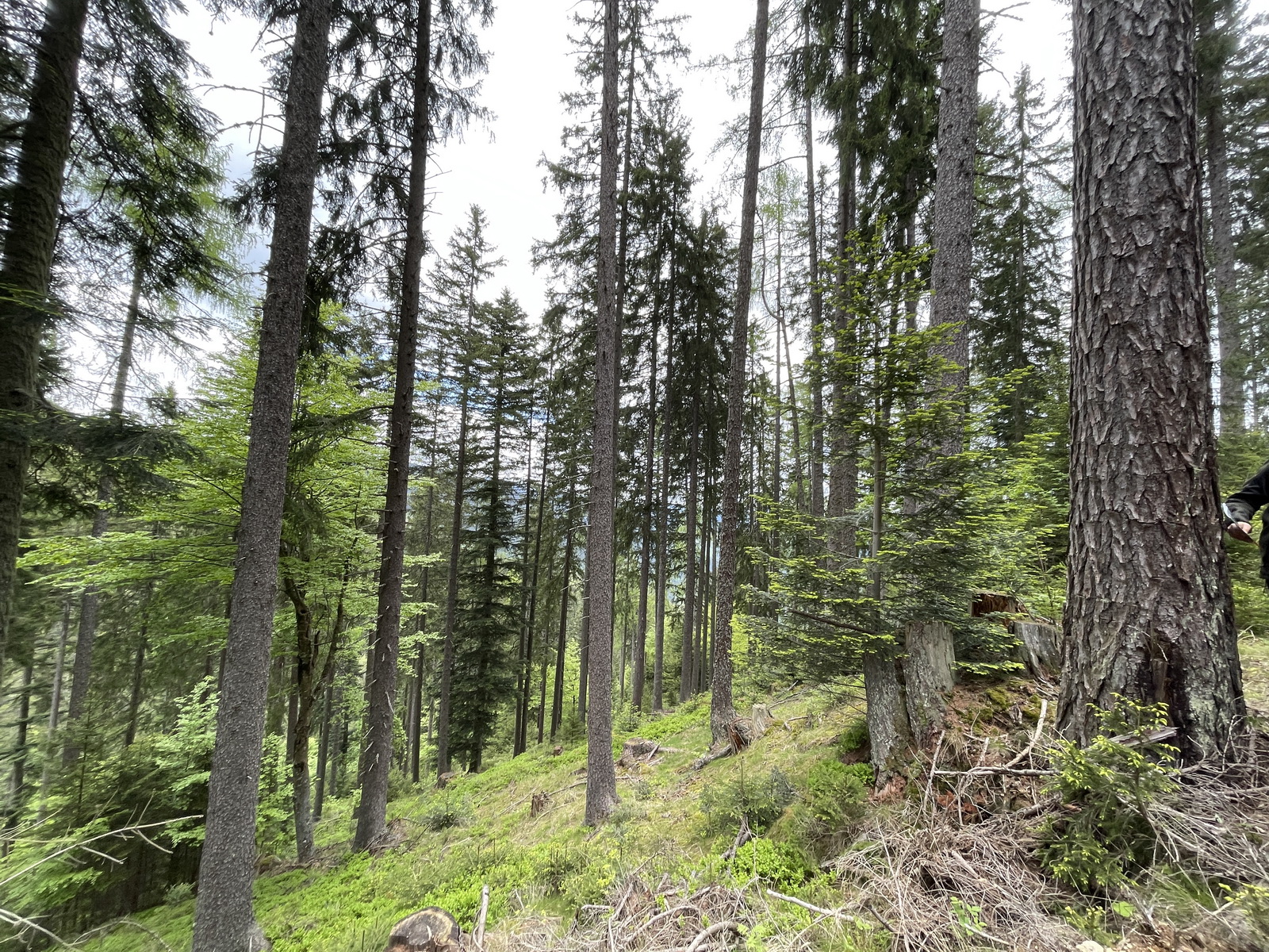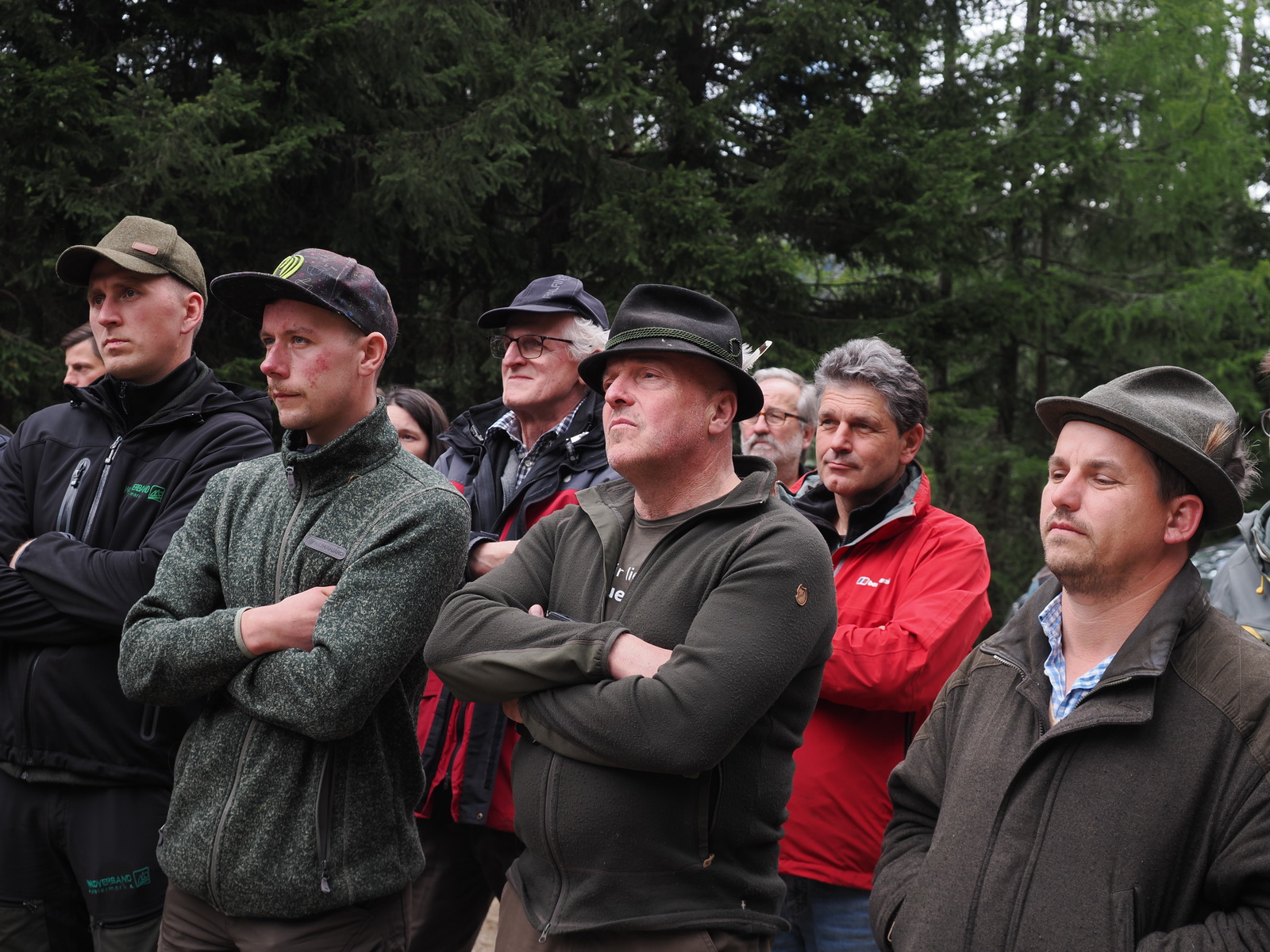Nach einer kurzen Betriebsvorstellung durch DI Alberich Lodron wurde einer der ersten Bestände, welche um ca. 1990 von der Kahlschlagwirtschaft auf das Dauerwaldsystem (Plenterung) umgestellt wurden, besichtigt. Zum Zeitpunkt der Umstellung befand sich auf diesem Standort ein Altholzbestand, welcher Schritt für Schritt geöffnet wurde, um die Naturverjüngung und die Mehrschichtigkeit des Bestandes zu fördern. Nach 35 Jahren Umstellung weist der Bestand bereits mehrere Schichten und eine Verteilung über alle Altersklassen auf. Bei den Nutzungen wird immer auf die Qualität der verbleibenden Individuen und auf die Zielstärke, welche 60 cm Brusthöhendurchmesser beträgt, geachtet.