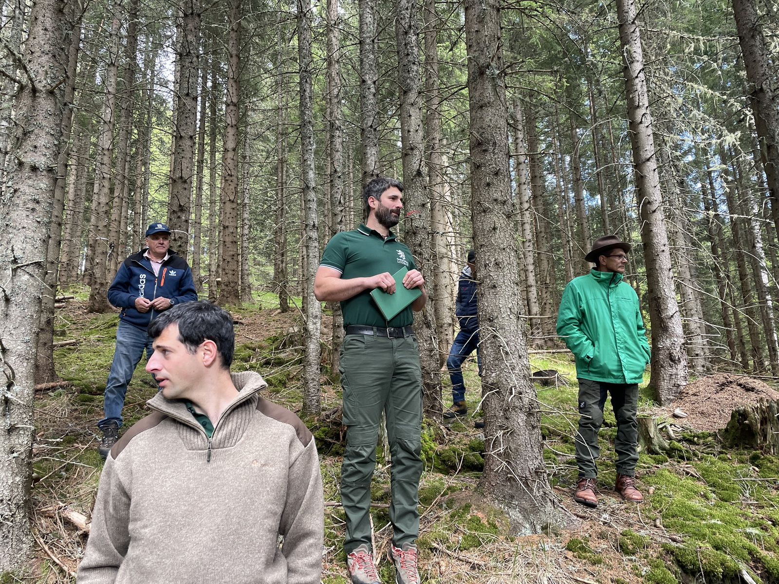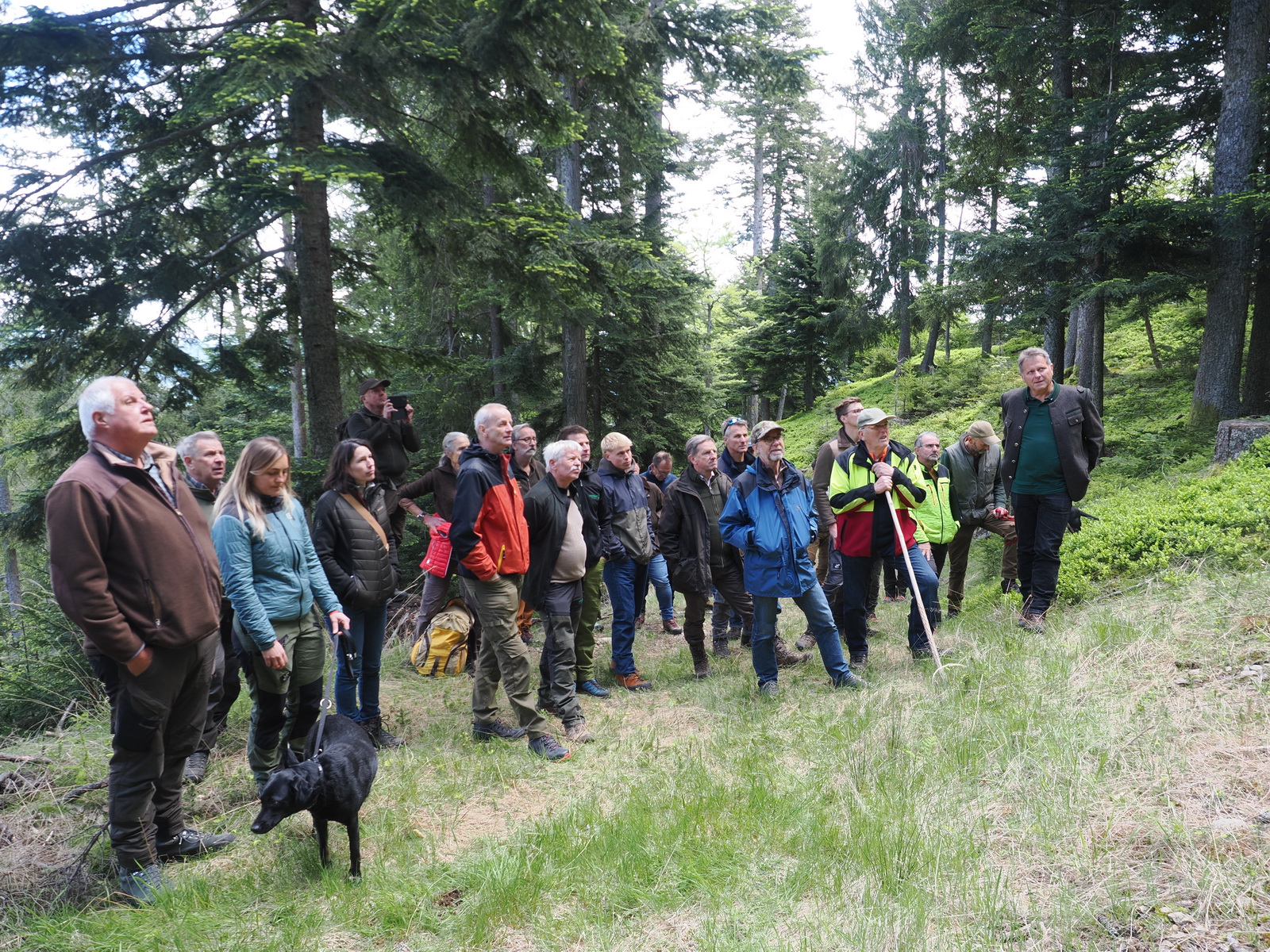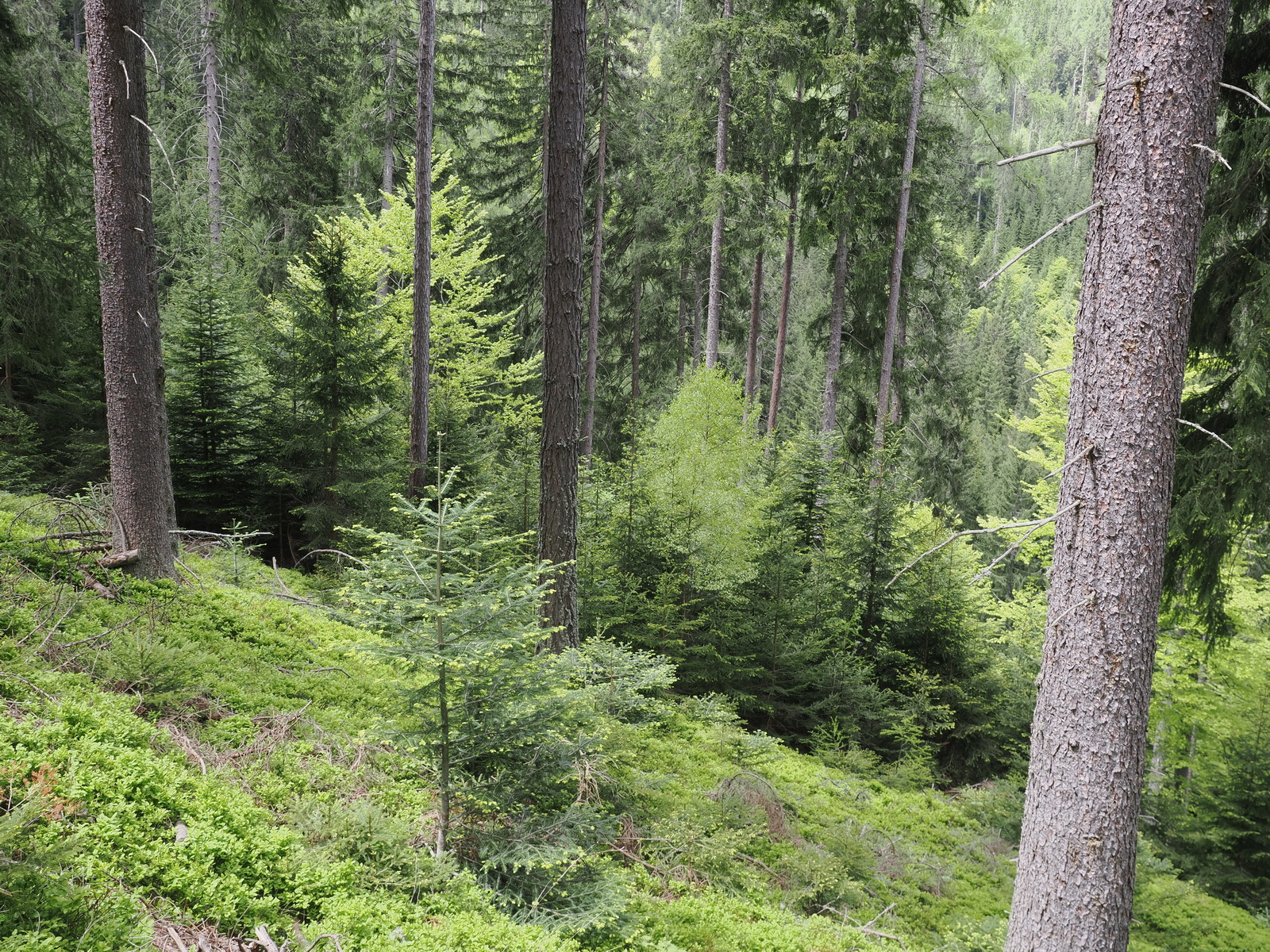 Nach einer kurzen Betriebsvorstellung durch DI Alberich Lodron wurde einer der ersten Bestände, welche um ca. 1990 von der Kahlschlagwirtschaft auf das Dauerwaldsystem (Plenterung) umgestellt wurden, besichtigt. Zum Zeitpunkt der Umstellung befand sich auf diesem Standort ein Altholzbestand, welcher Schritt für Schritt geöffnet wurde, um die Naturverjüngung und die Mehrschichtigkeit des Bestandes zu fördern. Nach 35 Jahren Umstellung weist der Bestand bereits mehrere Schichten und eine Verteilung über alle Altersklassen auf. Bei den Nutzungen wird immer auf die Qualität der verbleibenden Individuen und auf die Zielstärke, welche 60 cm Brusthöhendurchmesser beträgt, geachtet.