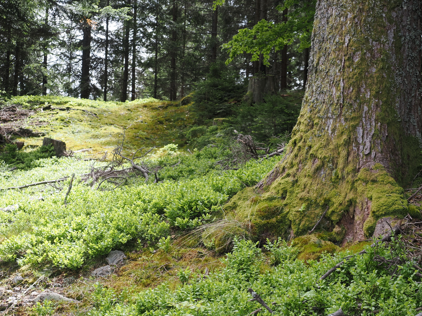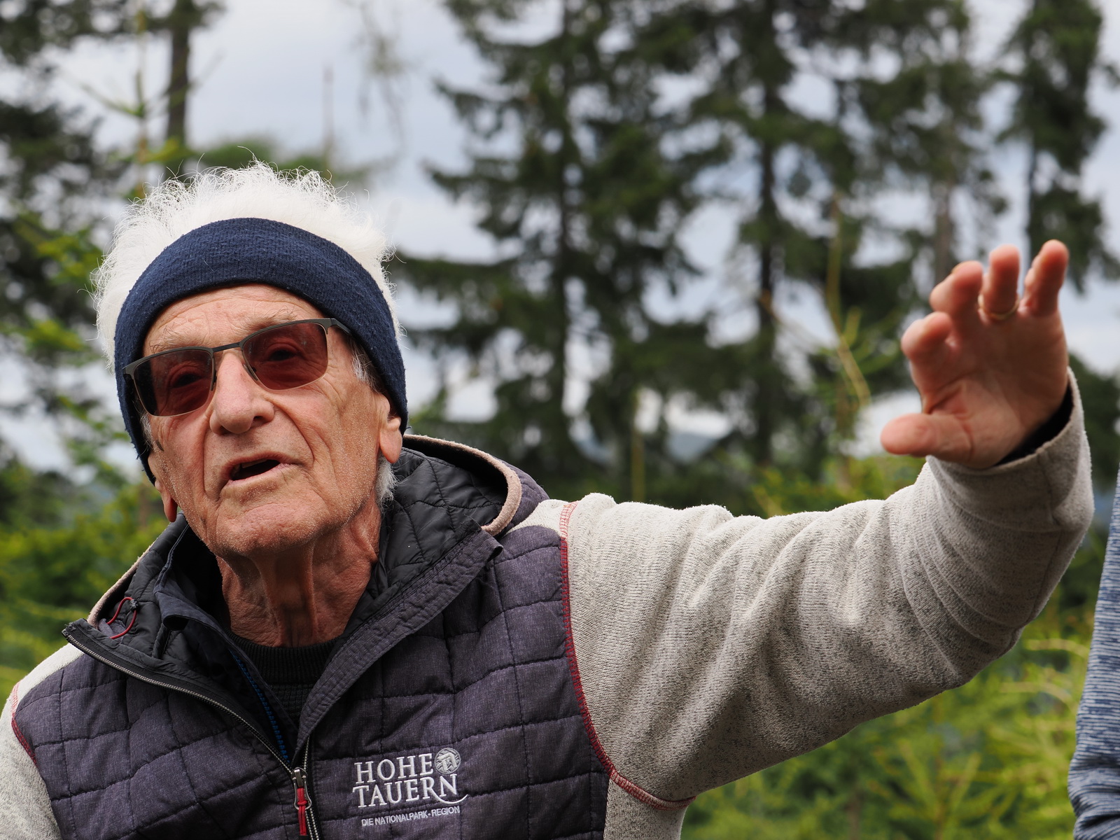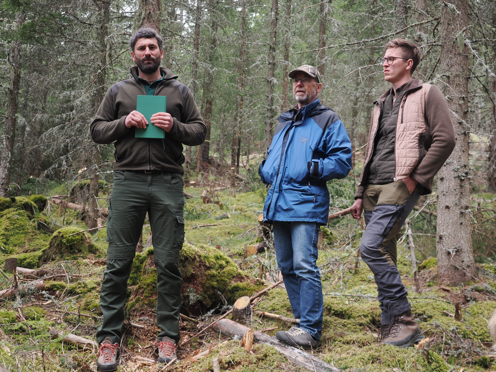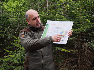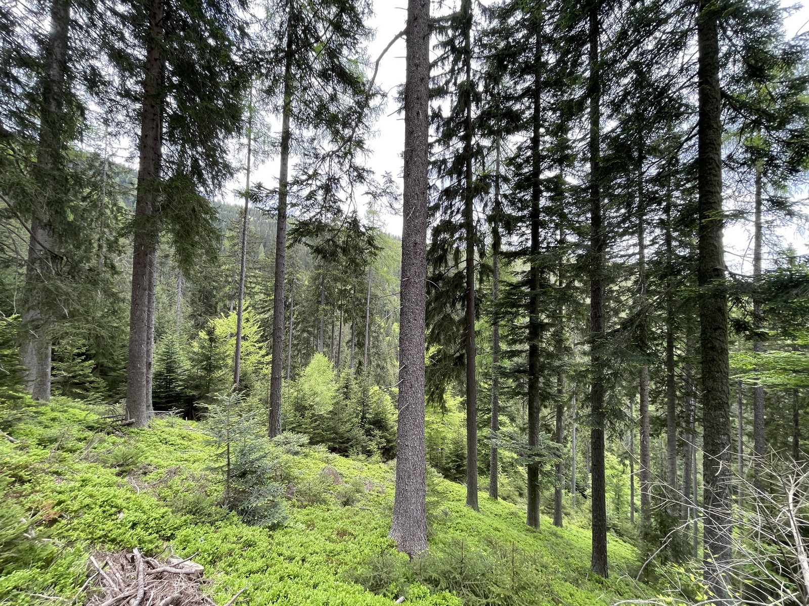 Nach einer kurzen Betriebsvorstellung durch DI Alberich Lodron wurde einer der ersten Bestände, welche um ca. 1990 von der Kahlschlagwirtschaft auf das Dauerwaldsystem (Plenterung) umgestellt wurden, besichtigt. Zum Zeitpunkt der Umstellung befand sich auf diesem Standort ein Altholzbestand, welcher Schritt für Schritt geöffnet wurde, um die Naturverjüngung und die Mehrschichtigkeit des Bestandes zu fördern. Nach 35 Jahren Umstellung weist der Bestand bereits mehrere Schichten und eine Verteilung über alle Altersklassen auf. Bei den Nutzungen wird immer auf die Qualität der verbleibenden Individuen und auf die Zielstärke, welche 60 cm Brusthöhendurchmesser beträgt, geachtet.