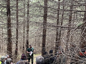 Am Nachmittag wurde dann eine Läuterungsfläche besichtig. Die Fläche ist aufgrund eines Windwurfereignisses entstanden. Sie ist mit Fichten und Lärchen bestockt. Bei der Läuterung wurde darauf geachtet, dass die gesunden Lärchen weiterhin im Dichtstand geschützt werden. Dafür wurden die Fichten, welche sich neben den Lärchen befinden „geköpft“, sodass sie den unteren Stammbereich der Lärchen gegen Fegeschäden schützen.