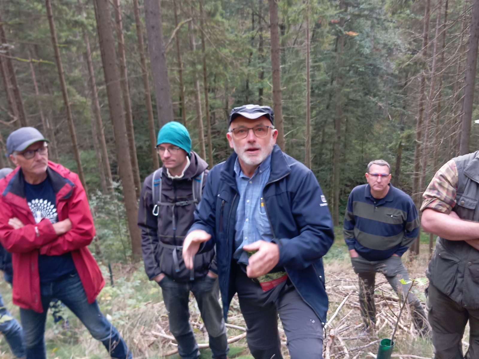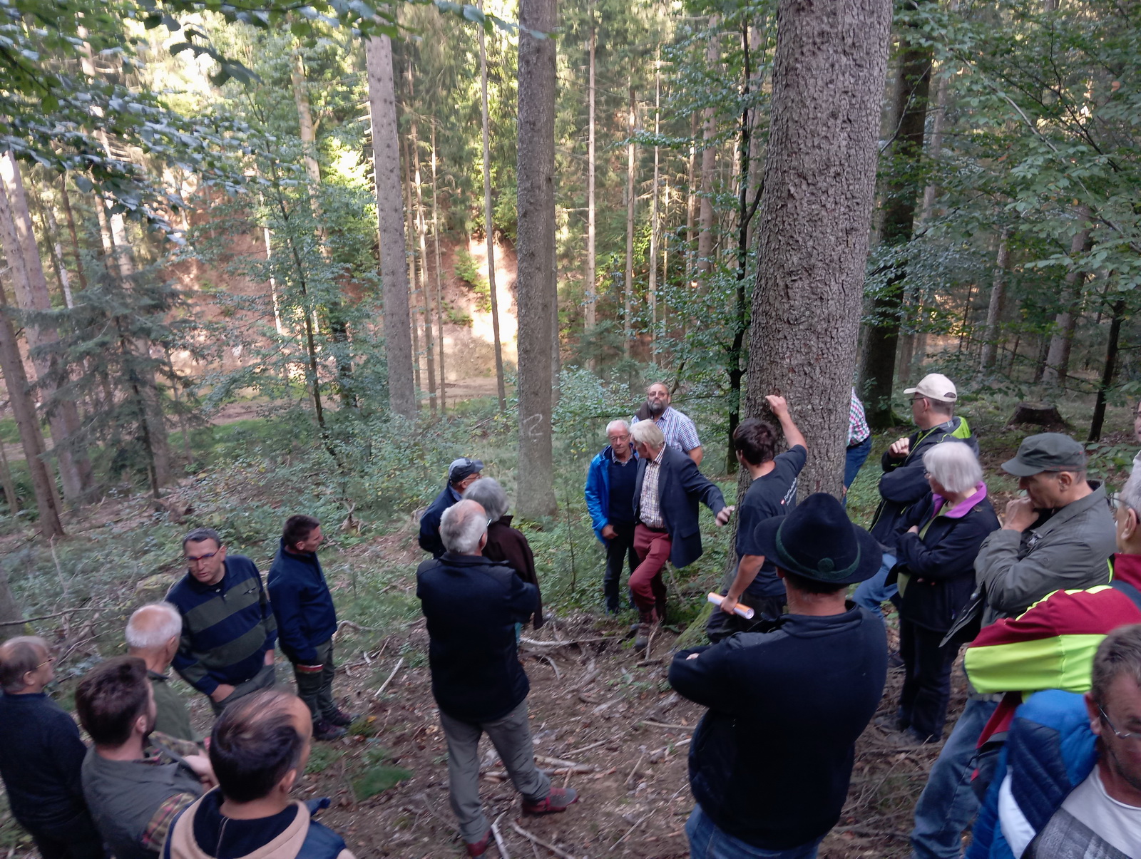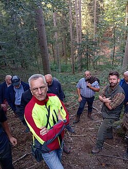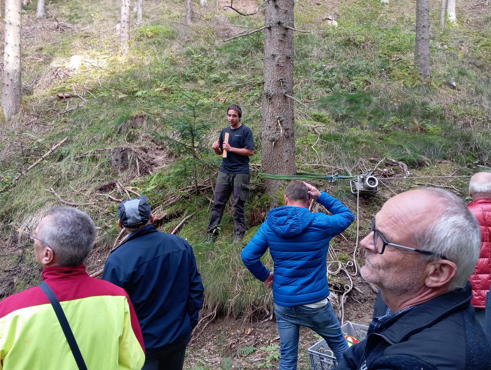 Am 06. Oktober 2023 fand die Regionaltagung OÖ in den Waldungen von Familie Bachner statt. Teilge-nommen haben knapp 35 Interessenten, wobei hier rund die Hälfte der Teilnehmer auf den Jagdaus-schuss Natternbach fällt. Durch die kollegiale Waldberatung war diese Exkursion eine gute Möglichkeit für den jungen Bewirtschafter Julian Bachner und seinen Vater Siegfried Bachner ihr Waldbewirtschaf-tungskonzept vorzustellen. Gleichzeitig jedoch von den vielfältigen Ideen und Vorschlägen der Teilneh-mer*innen zu profitieren. Besonders hat es uns gefreut, dass der neue Forstbetriebsleiter der Stiftung Herzog von Sachsen-Coburg und Gotha´schen Familie, DI Andreas Schreyer die Veranstaltung bereichert hat. Als direkter Grundnachbar konnten umfassende Zusammenhänge hergestellt werden. Besonders veranschaulicht wurden die extremen standörtlichen Unterschiede zwischen Nord- und Südhang. Mit viel Engagement versucht Familie Bachner die insgesamt fünf Hektar großen fichtenreiche, einschichten Bestände in einen strukturreichen Dauerwald zu überführen. Julian Bachner ist ausgebildeter Forstwart und will das gelernte Umsetzen. Es liegen noch vielfältige Herausforderungen vor Ihm, besonders das Einbringen zusätzlicher Baumarten, die Feinerschließung und die Verjüngungssituation stehen am Programm. Ein Highlight des Tages waren die Vorführung der Spillwinde für die Vorrückung in den Steilhängen und das Abtragen von Bäumen für eine bestandesschonende Entnahme durch Siegfried Bachner.