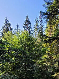 Vom fichtenreichen Bestand in Richtung artenreichen klimafitten Dauerwald. Nach der Absolvierung der Forstfachschule versuche ich das Gelernte in der Praxis umzusetzen. Ich versuche durch Einbringung verschiedenster Baumarten eine Risikostreuung auf der Fläche zu haben.