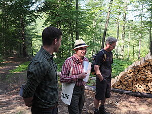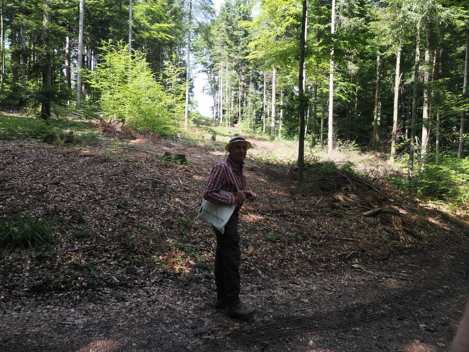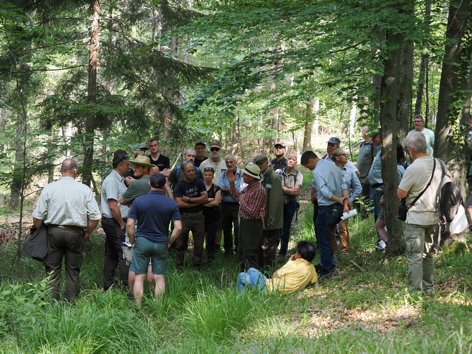 Bei einem weiteren Exkursionspunkt wurde ein knapp 50-jähriger Fichtenbestand mit flächiger Naturverjüngung aus Tanne und Buche besichtigt, solche Bilder werden den Teilnehmer/innen wohl in Erinnerung bleiben, da solche leider in den Wäldern viel zu selten sind. Es zeigt sich, dass durch waldbauliches und jagdliches Engagement eine Naturverjüngung mit wertvollen Mischbaumarten aufkommt. Probleme wie Mistelbefall an Alttannen und Tannentrieblaus verdeutlichen, dass jede Baumart ihre forstschutztechnischen Herausforderungen mit sich bringt. Auch hier wurde die Bedeutung einer durchdachten Mischung betont.