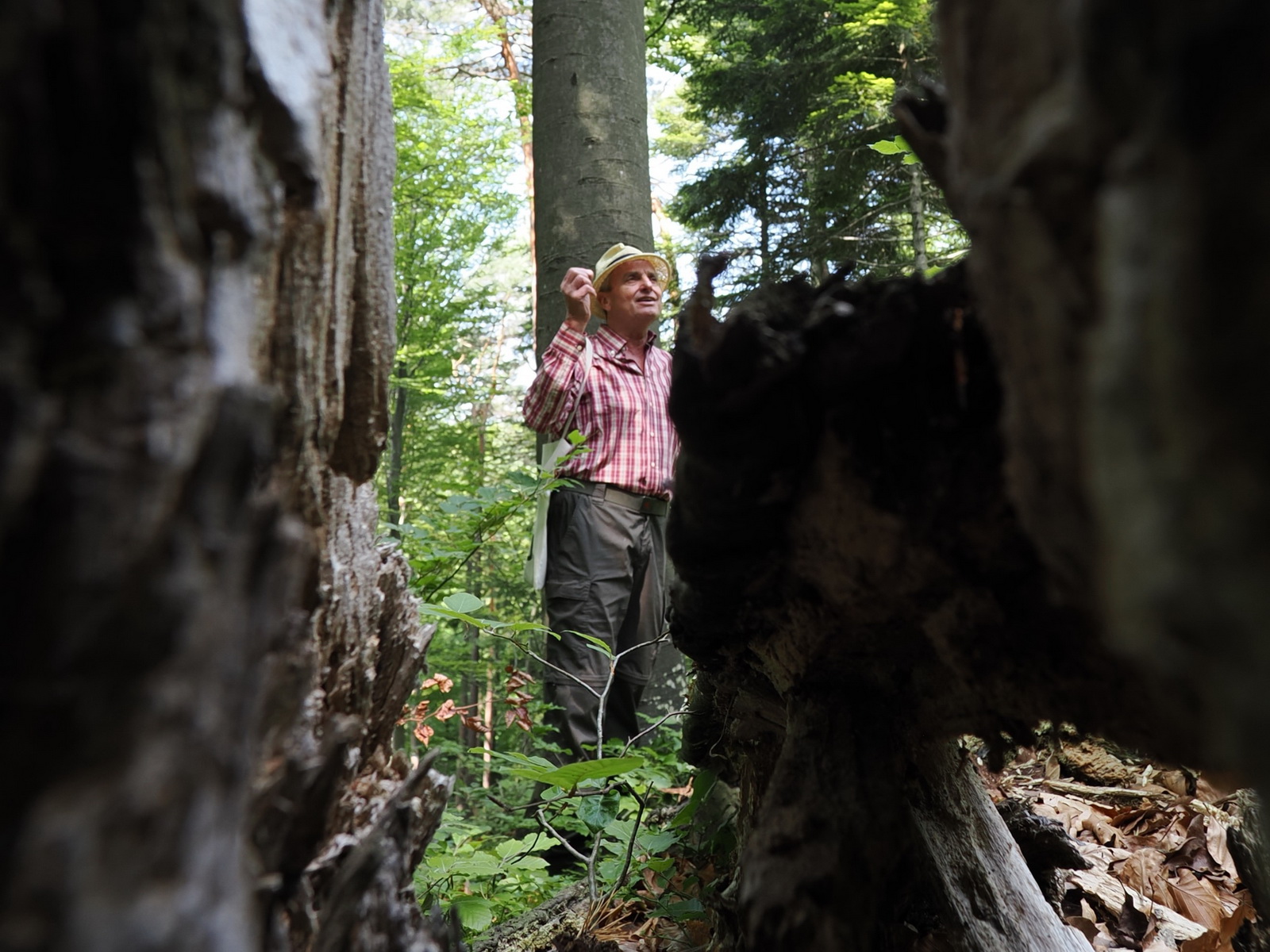 Ein zentrales Thema war die ökologische Bedeutung von Totholz und Spechtbäumen. Wo möglich wird vom Betriebsführer Totholz gezielt im Bestand belassen. Eine vor langer Zeit abgestorbene Buche diente lange Zeit als Spechtbaum. Mittlerweile beheimatet sie als liegendes Totholz zahlreiche Insekten-, Pilz- und Tierarten. Am Betrieb bleibt generell im Zuge von Holznutzungen sämtliches Astmaterial im Wald und dient als Nährstoffquelle.