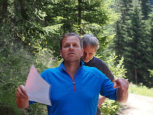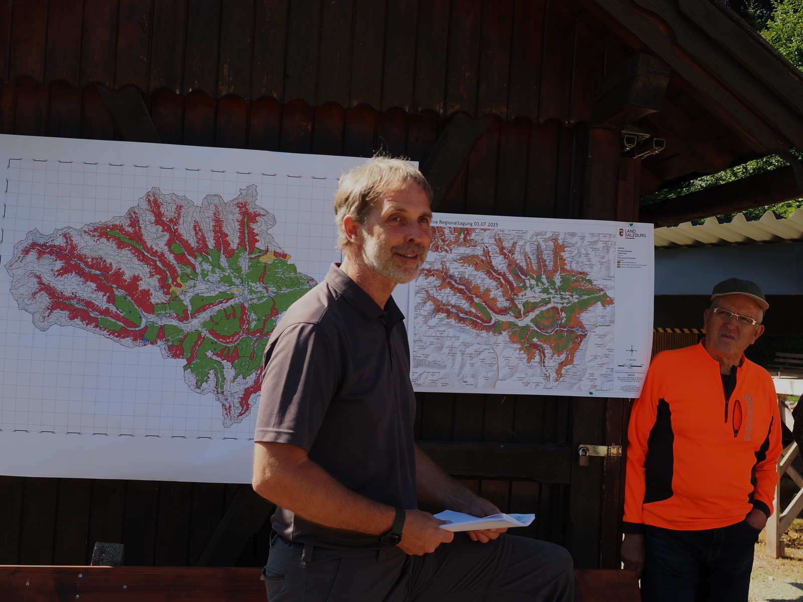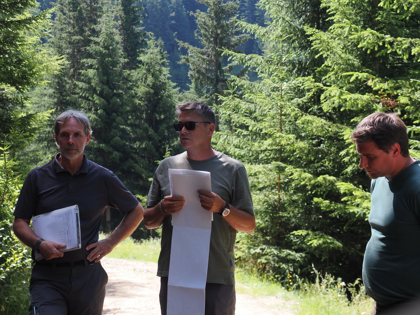 Der örtlich zuständige Förster der BH Tamsweg Ing. Martin Lofeyer und der örtlich zuständige Referent der Landesforstdirektion Dominik Posch, sowie DI Peter Daxner, Schutzwaldreferent der Landesforstdirektion Salzburg, stellten die Maßnahmen und wirtschaftlichen Eckzahlen beim Lawinenstrich Weischg und den Borkenkäferschäden am Gegenhang im Bereich des Jonesgrabens vor.