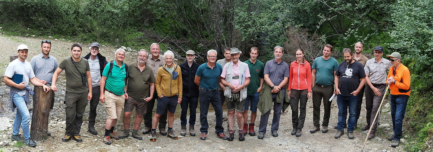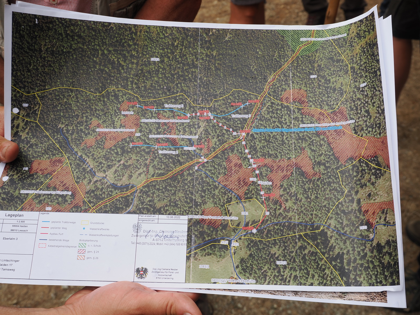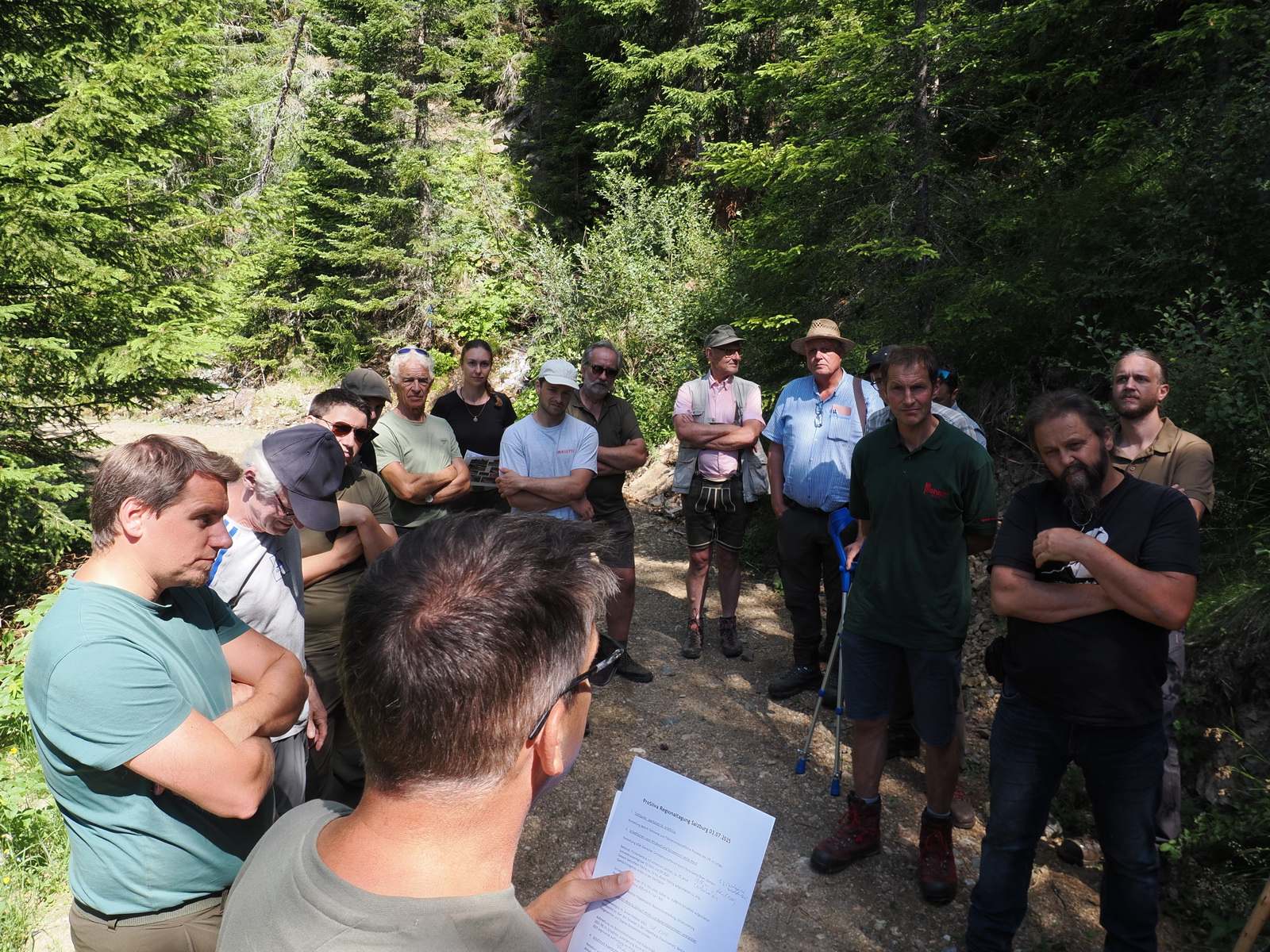 Die 23 Teilnehmer der Exkursion in den Schutzwald der Agrargemeinschaft Göriacher Genossenschaftswald konnten aktuelle Probleme und Lösungen der Waldbewirtschaftung diskutieren. Um Borkenkäferausbreitungen zu verhindern und die Waldverjüngung einzuleiten, werden auch in extremem Steilgelände gezielte Fällungen, teilweise auch mit Hubschrauberbringung durchgeführt. Die Entscheidung zwischen Belassen und aktivem Eingreifen in eine schwierige Balance zwischen des Aspekten Walderhaltung, Sicherheit und Risiko, sowie wirtschaftichem Abwägen inkl. der Fördermöglichkeiten von Einzelmaßnahmen. Obmann Hans-Georg Draxl erläuterte die Prinzipien der Arbeitsteilung innerhalb der Agrargemeinschaft.