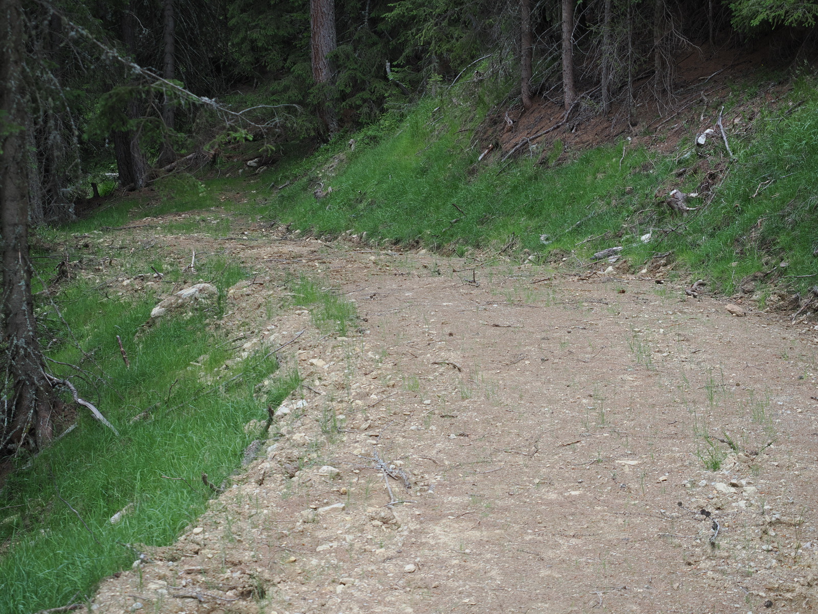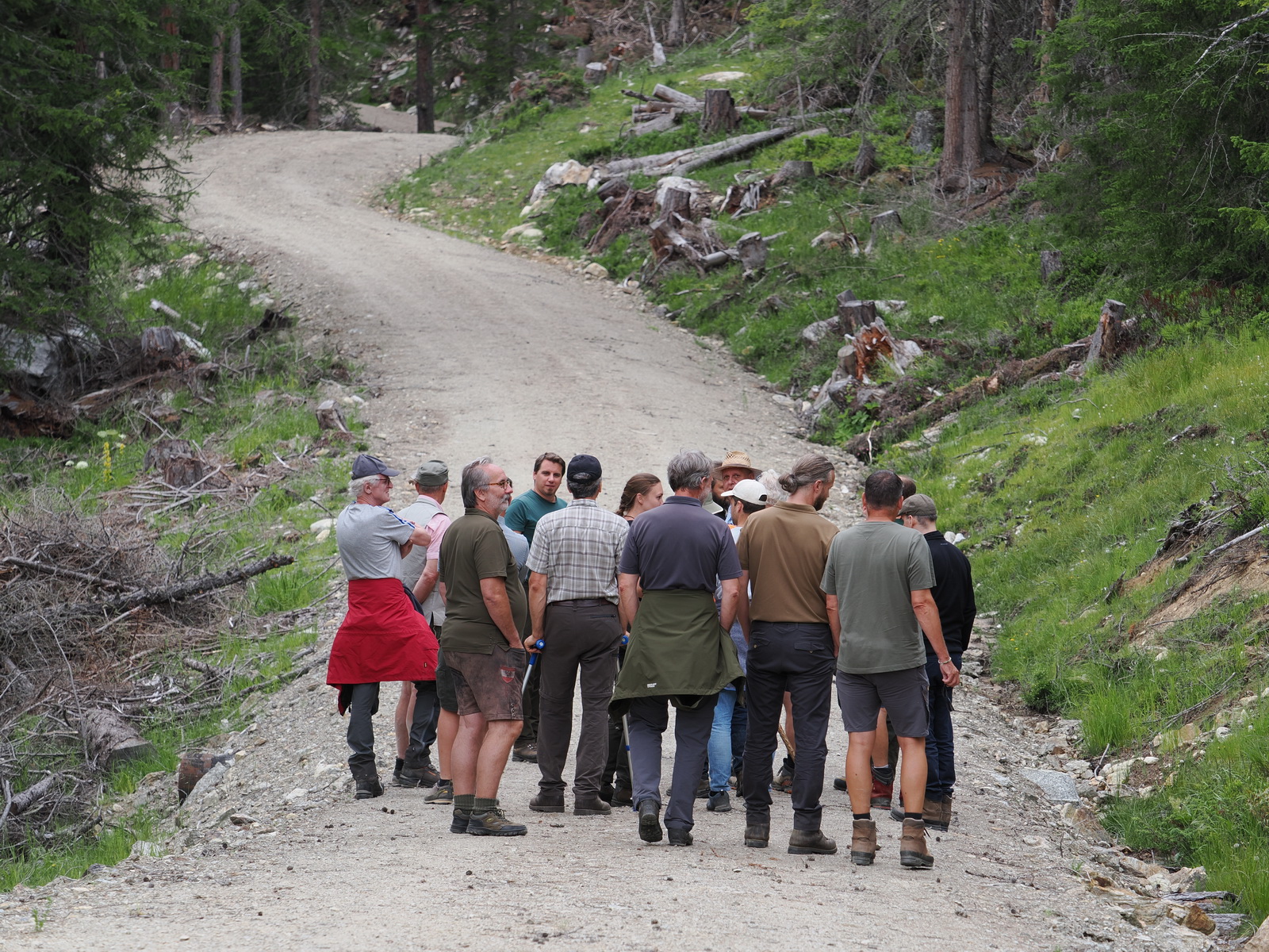 Am Nachmittag konnte oberhalb des Prebersees ein vorbildlicher Forstwegebau - geplant von ZT DI Clemens Neuber - mit Furten, einem Knüppelweg zur Querung von sickerfrischem Wollgrasrasen und guter Einbindung der Böschungsflächen besichtigt und diskutiert werden. Das in einem Landschaftsschutzgebite mit geschützen Lebensräumen (Niedermoore) ein Forstwegebau überhaupt zugelassen wurde, ist nur durch angepaßte Detailplanung und große Rücksichtnahme auf die Naturverhältnisse möglich. Mit 700 lfm Neubau und Sanierung von Forststrassen und zwei Traktorwegen wurden 15 ha Wald zu Kosten von 65,- €/lfm erschlossen.