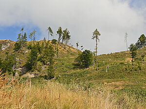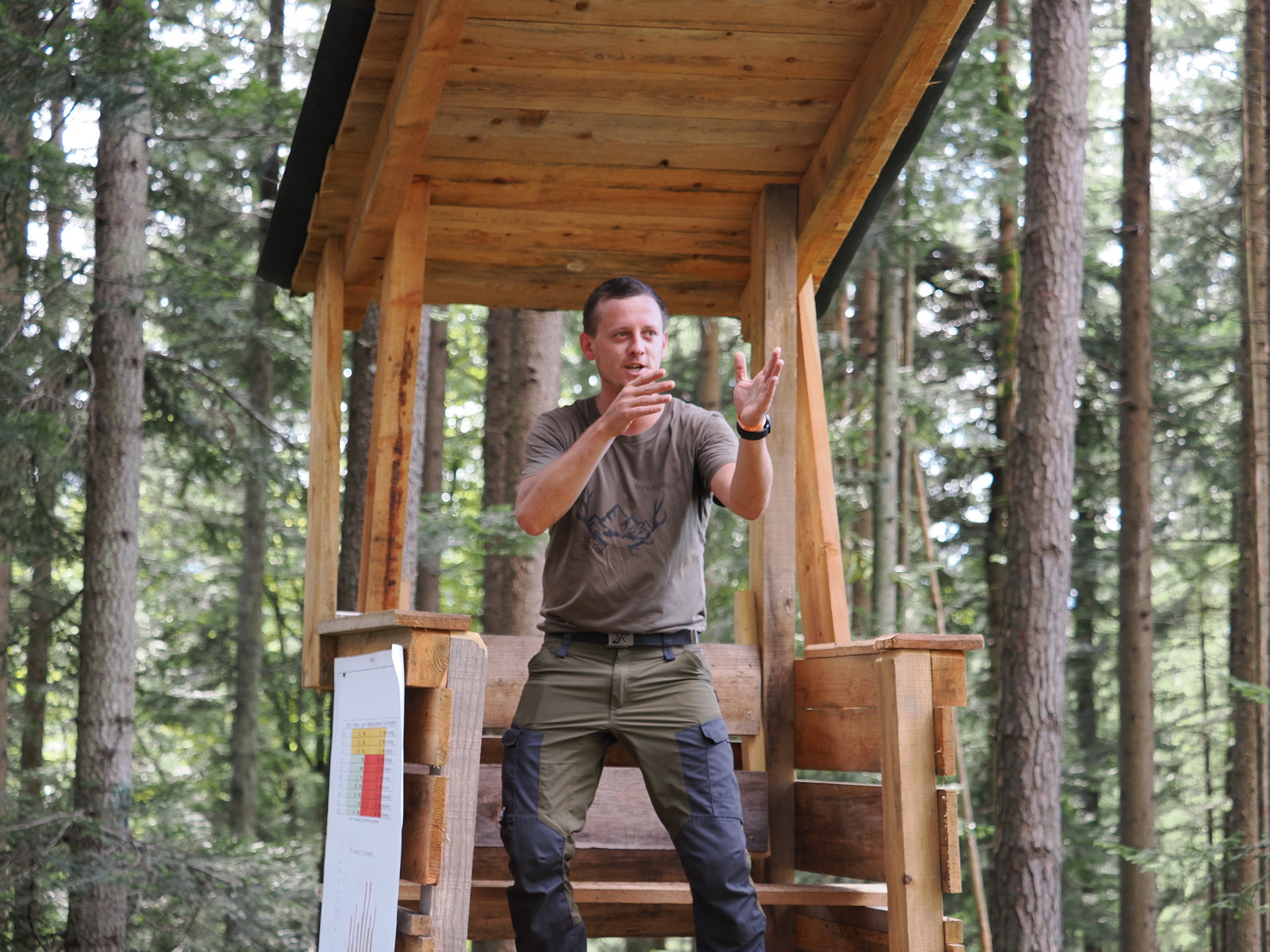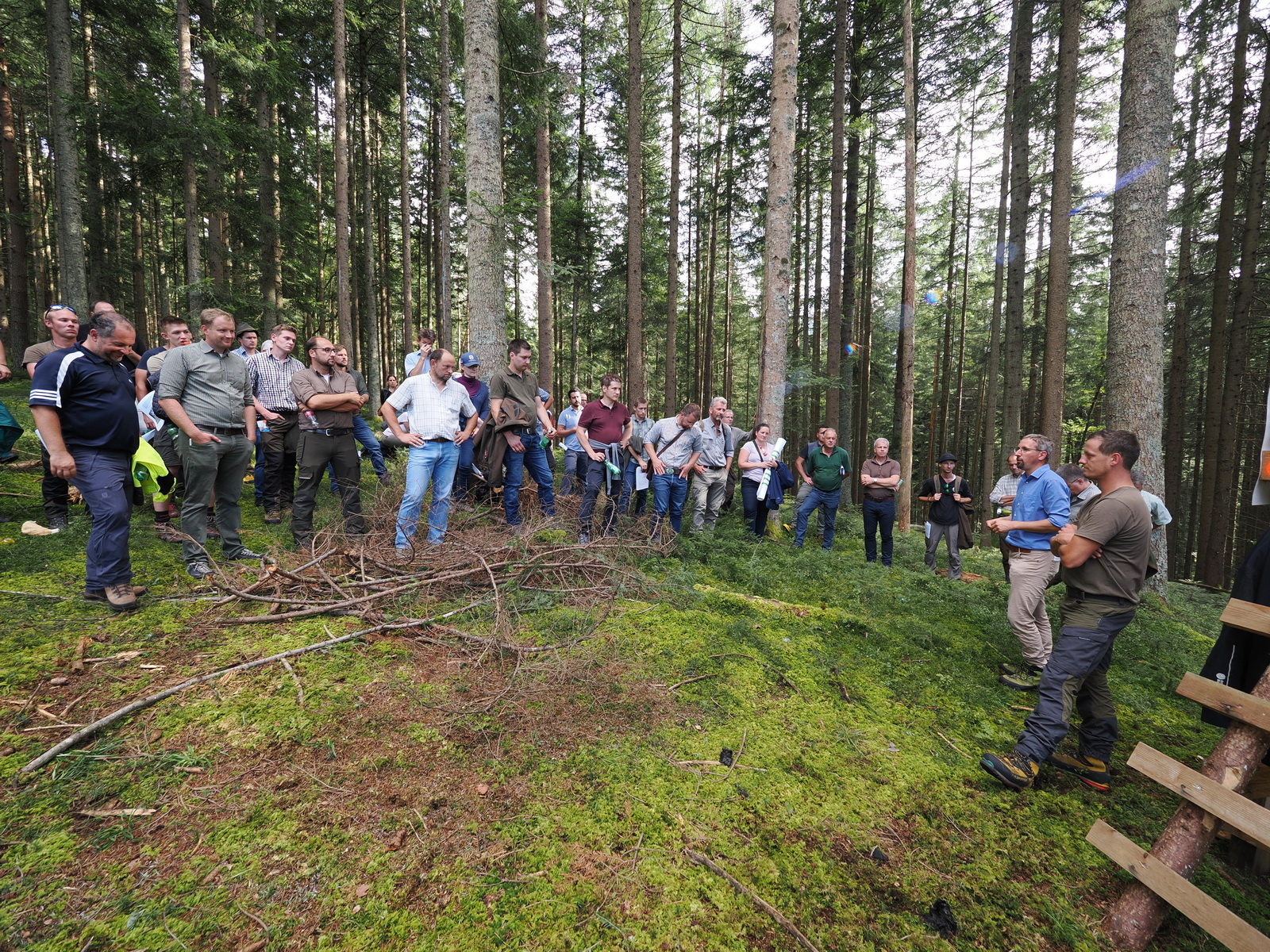 Nach dem theoretischen Teil des Tages standen im Outdoor-Teil zwei Exkursionspunkte an der Tagesordnung. Das erste Ziel war das St.Lorenzer „Alpl“ im Gitschtal, in ca 1.200 Metern Seehöhe, wo im Sommer 2017 innerhalb einer Viertelstunde ein Sturm den Waldbestand im Ausmaß von etwa 40 Hektar radikal vernichtet hat. Über die dort überaus gut gelungenen Aufforstungsmaßnahmen freute sich auch Bezirks-Jägermeister Raphael Gressel. „Durch die sinnvolle Anwendung unseres liberalen Kärntner Jagdgesetzes können wir hier wieder einen artenreichen Wildbestand erhalten, besonders im Sinne der Land- und Forstwirtschaft. So kann in Zukunft vieles gelingen, was bisher unmöglich war.“