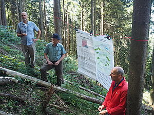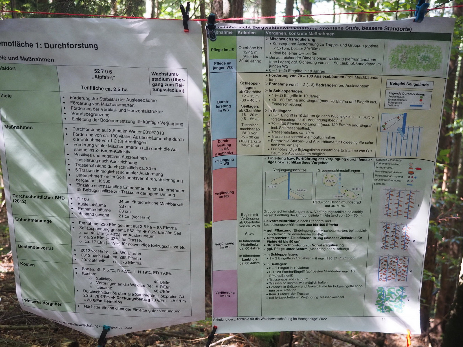 Extrem spannend für die Teilnehmer war nach der theoretischen Einführung in die Bergwaldrichtlinie die praktische Umsetzung im zunächst steilen Bergwald (Seilgelände). Und hier kamen sogar erfahrene Pro Silva – Mitglieder aus dem Staunen nicht heraus, wie 60-jährige, von Fichte dominierte mittlere Baumhölzer im steilen Seilgelände in Buchen-Tannen-(Fichten)-Mischwälder kahlschlagfrei umgewandelt werden. Die Waldbilder waren beeindruckend: Tannen und Buchenverjüngung (+ sonstige Laubholzarten wie Bergahorn, Eiche, etc.) nahezu ohne Verbissschäden auf ca. 30 bis 50 % der Bestandesfläche. Nur Fichte (!!) wurde nachgebessert zur Sicherung der Baumartenvielfalt und zum Zurückdrängen der drohenden Verbuchung, was für einen Lawinenschutzwald (wie in diesem konkreten Fall) kontraproduktiv für die Erhaltung der Schutzwirkung wäre. Die durchgeführten Pflegemaßnahmen waren trotz Seilbringung kostendeckend mit gratis Mischverjüngung auf 30 bis 50 % der Bestandesfläche (= Versicherung für die Zukunft). Mit einem bis zu Ende gedachten Bringungskonzept (siehe Foto), welche die langfristige Überführung in zwei- bis mehrschichtige Schutzwaldbestände vorausschauend plant, um die Holzernteschäden am Bestand und an der Verjüngung zu minimieren. Selbstverständlich wird jeder Baum vom Revierförster ausgezeigt, um ein optimales Ergebnis bei der Holzernte zu garantieren zu können.