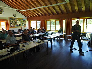 Exkursionsthema war die Vorstellung der Bergwaldrichtlinie der Bayerischen Staatsforste (BaySF), wobei der Vormittag im Bildungszentrum den theoretischen Grundlagen galt.