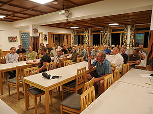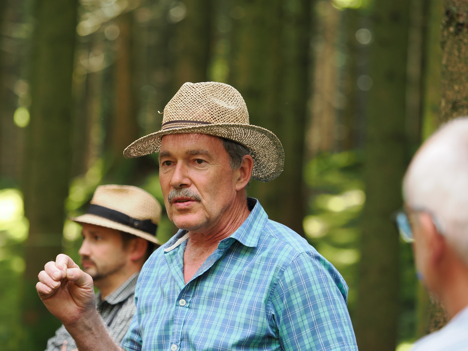 Holger Weinauge besitzt seit 2005 einen ca. 280ha großen Forstbetrieb in Mecklenburg-Vorpommern und ist dort aufgrund der standörtlichen Gegebenheiten dem Klimawandel voll ausgesetzt. Er berichtete uns darüber, welche Maßnahmen in kurzer Zeit gesetzt wurden um den Wald an die sich massiv veränderten Klimabedingungen (besonders Wasserhaushalt) anzupassen. Sein Bewirtschaftungskonzept basiert dabei vor allem auf Untersuchungen im Urwald Rothwald und bricht mit vielen gängigen Vorstellungen. So wird in seinem Wald nach einem Bodenschutzkonzept nur mit Pferd oder Raupenwinde gerückt und das bei Rückegassenabständen von mind. 80m. Ausgangspunkt der Umstellung war die Etablierung eines neuen Jagdregimes mit Intervalljagd und Duftreusenkonzept. Danach Aufbau eines Dauerwaldes durch „Struktur vor Hieb“ und „harmonisches Spiel von Licht und Schatten“. Urwaldmechanismen wurden durch ein Giganten- und Starkholzkonzept etabliert und die besondere Schonung der Mykorrhiza-Struktur ist ihm ein besonderes Anliegen. Das sehr kompetent und leidenschaftlich vorgestellte Bewirtschaftungskonzept löste rege Diskussion auch nach offiziellem Ende der Veranstaltung aus.