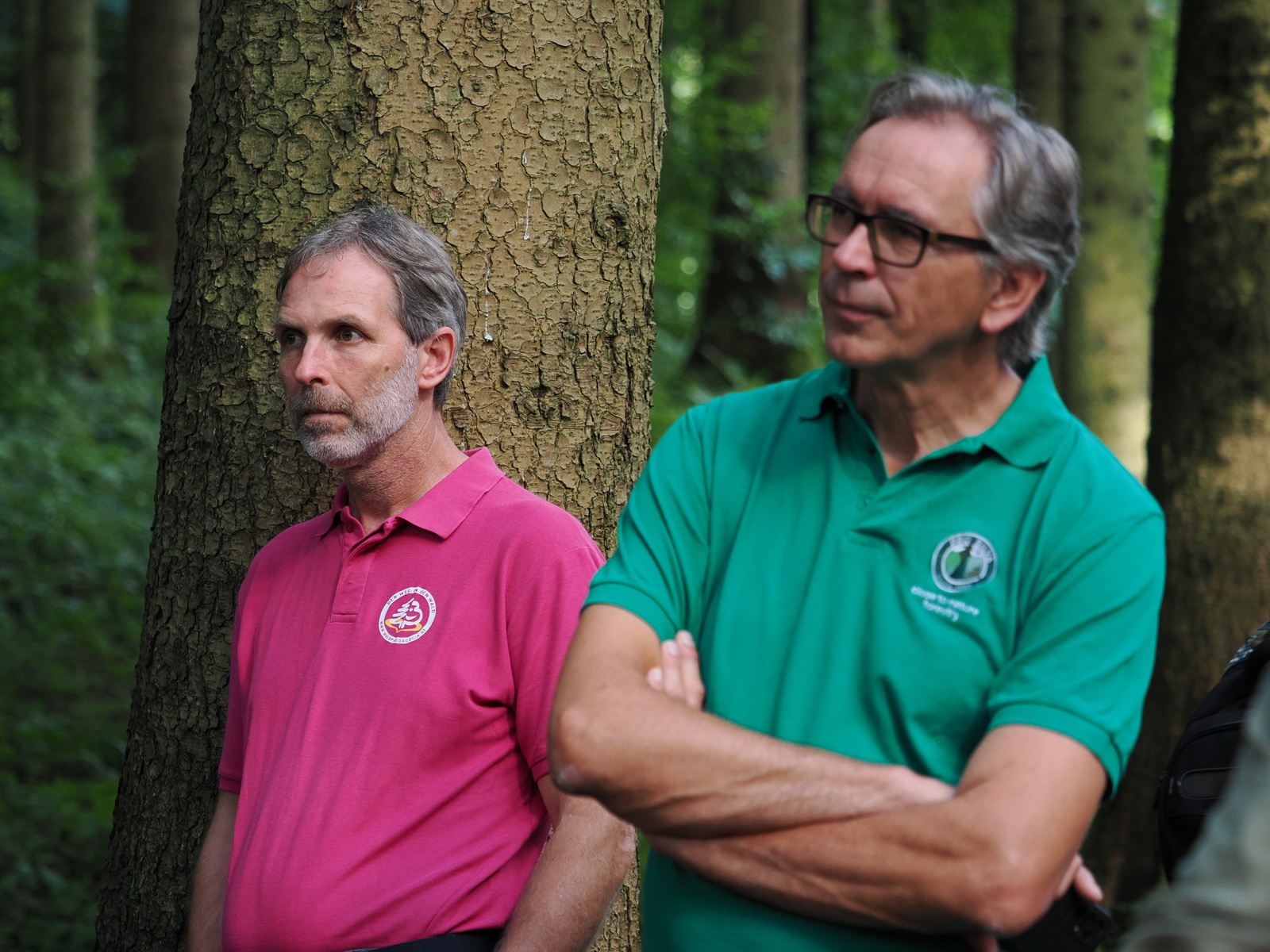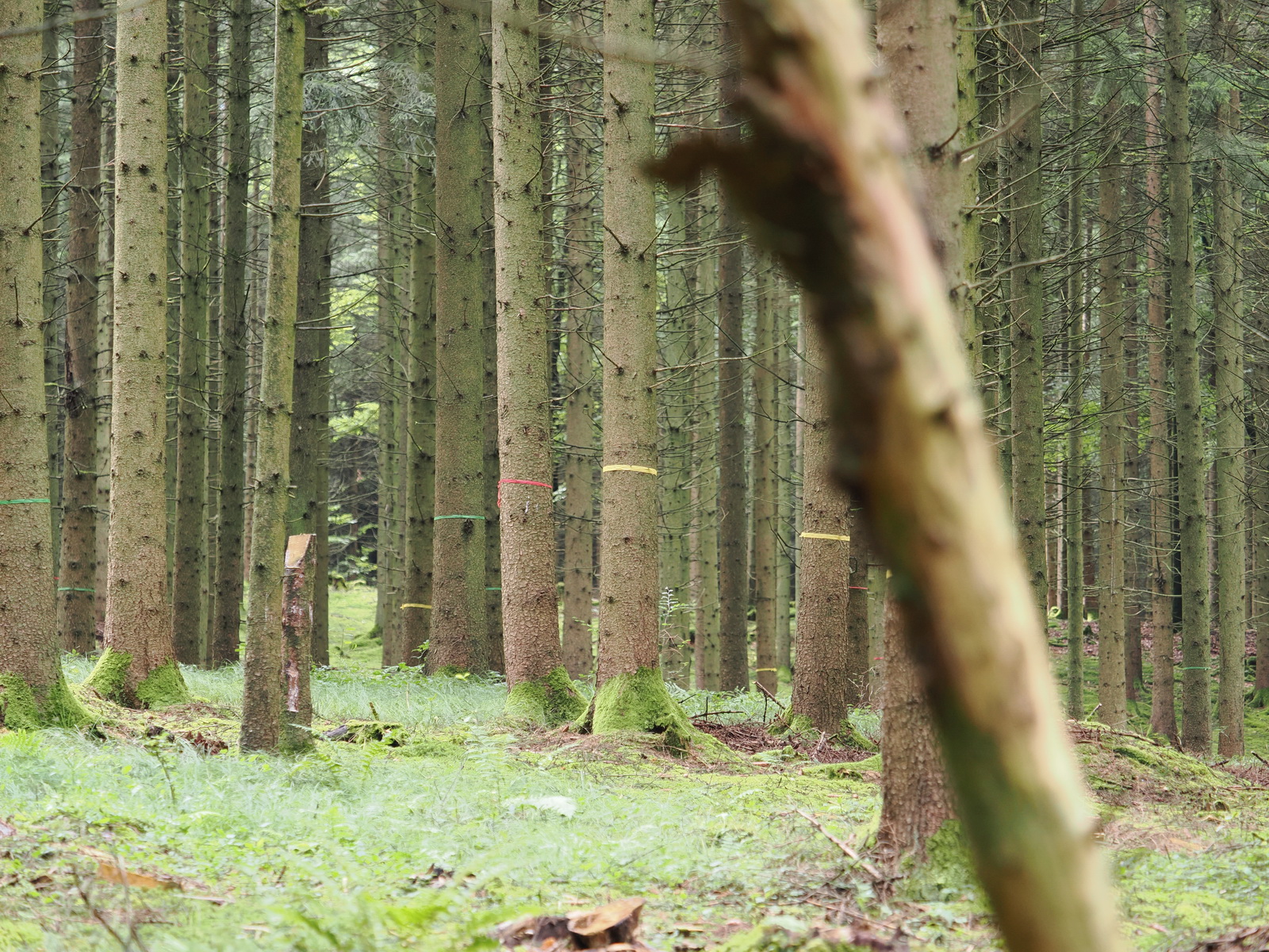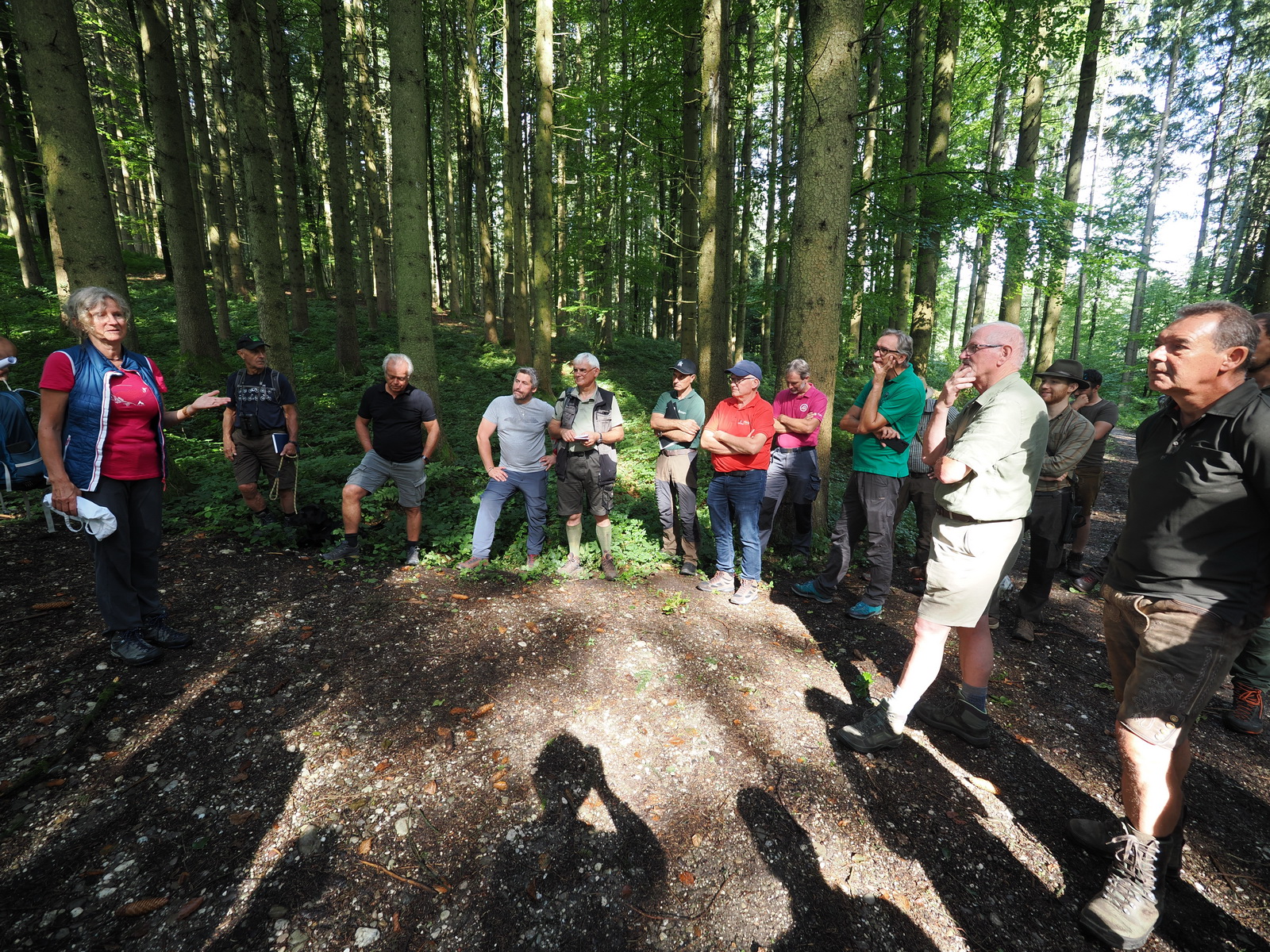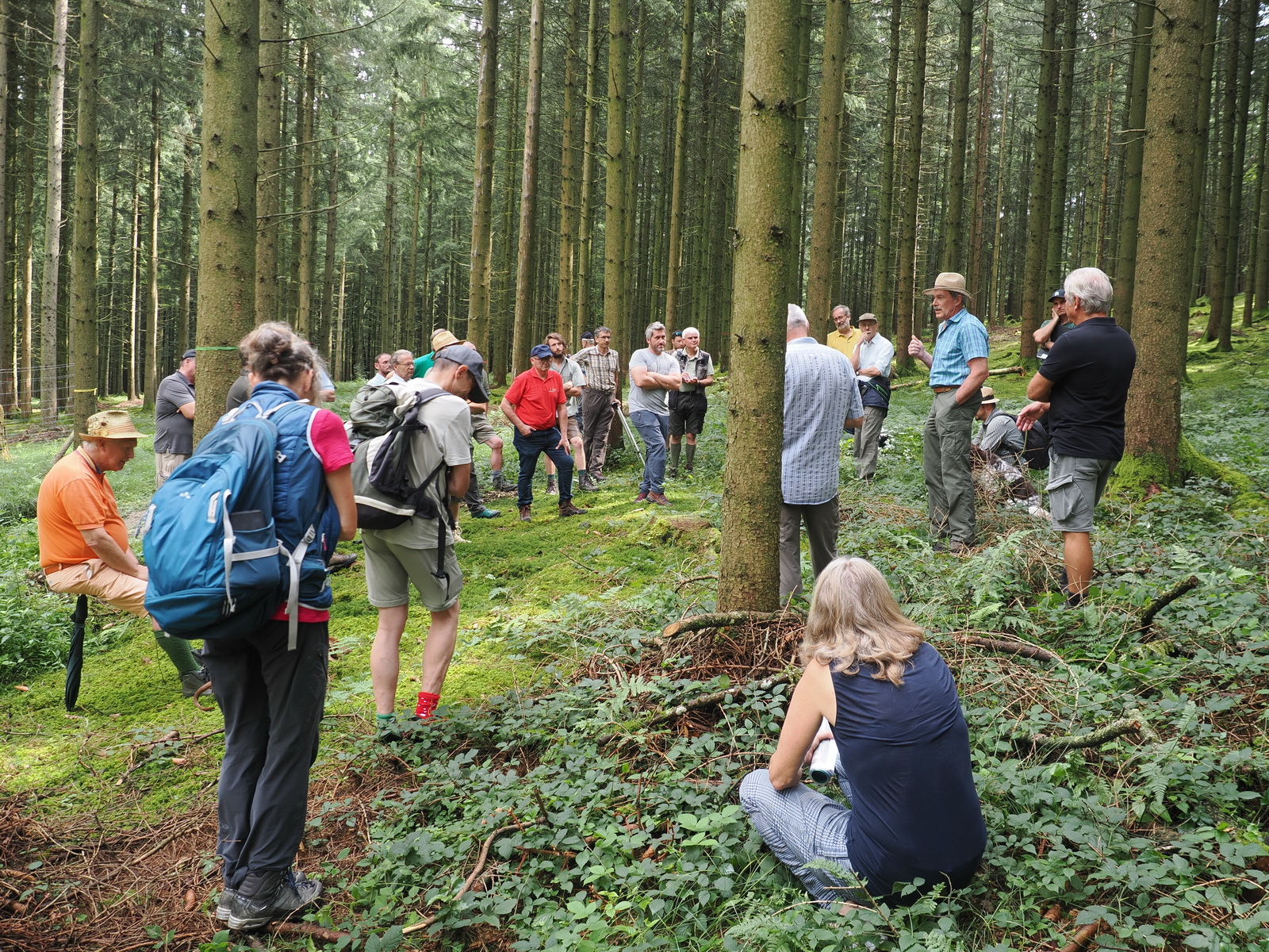 Auswirkungen der Waldbewirtschaftung auf den Wasserhaushalt wurden in verschiedenen Bestandesphasen (Kahlschlag, Laubstangenholz, Überführungsbestand) diskutiert. Rege Debatte gab es über den Versuch der Überführung des vorgefunden schwachen Baumholzes in einen Dauerwald mit einer Strukturdurchforstung. Einmal mehr konnten wir erkennen, dass ein später Beginn der Überführung uns vor große Herausforderungen stellt, um eine Strukturierung, Stabilisierung und Verjüngung zu erhalten.