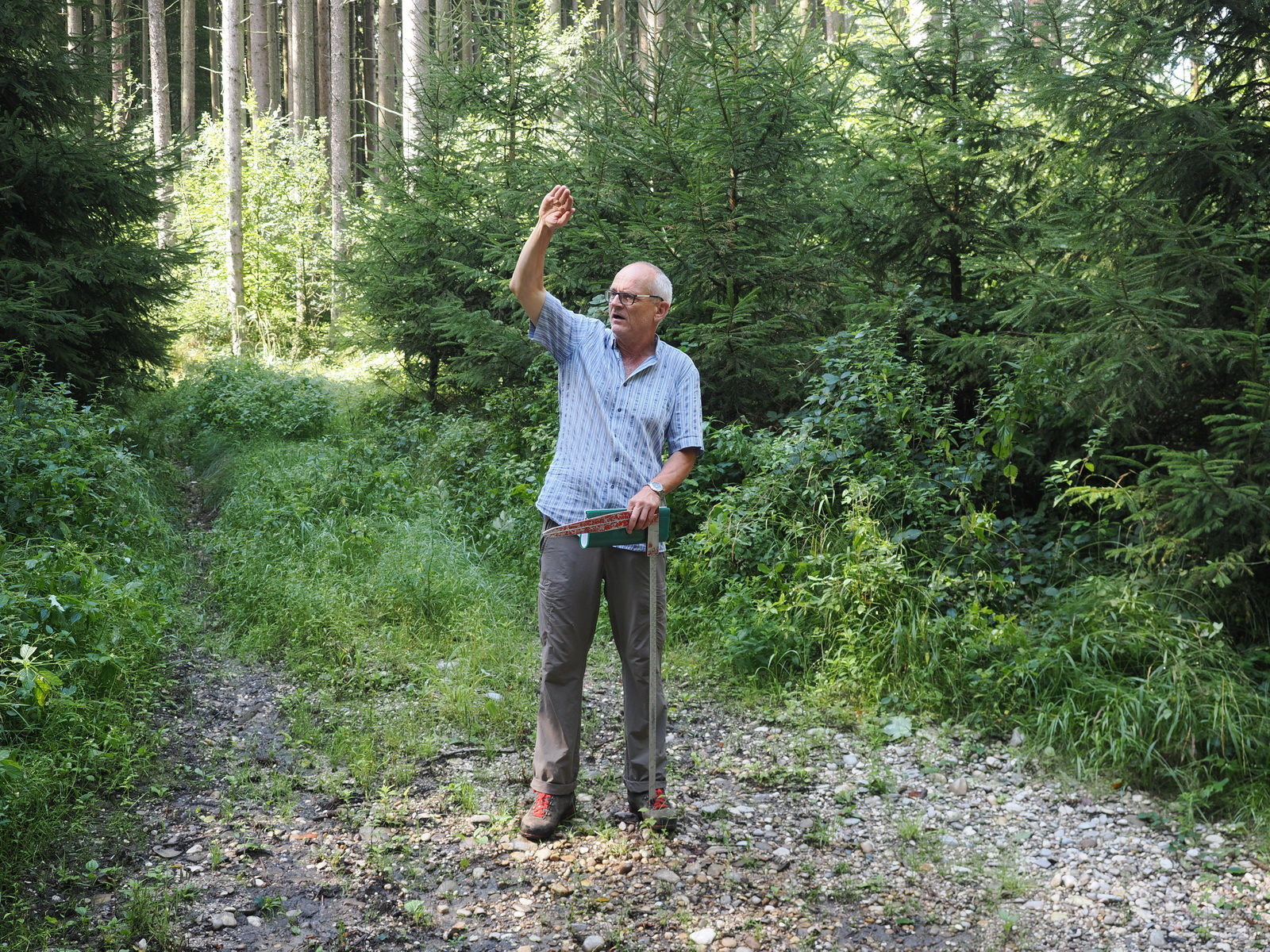 Hans Praxenthaler, Mitglied der Arbeitsgemeinschaft Naturgemäße Waldwirtschaft Bayern, beleuchtete den Dauerbrenner Forst-Jagd in sehr prägnanter Weise und bereicherte die Exkursion durch interessante Hinweise und praktische Tipps (z. B. Verdrängung der Brombeere auf Kalamitätsflächen durch Pappelstecklinge)