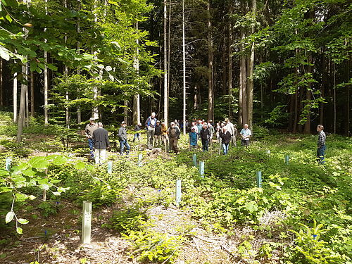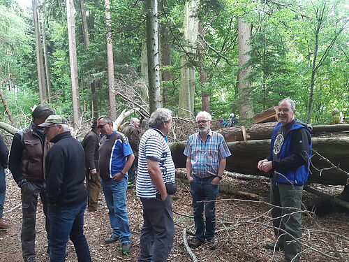 Auf dem Weg zu den weiteren Punkten merkte man deutlich, wie wertvoll eine gute Durchmischung des Waldbestandes ist. Während in der Fichtenmonokultur der Wind gut zu spüren war, herrscht im gestuften Mischwald Windstille. Dies mindert die Austrocknung des Waldbodens. Das abfallende Laub dient den Bodenlebewesen als Nahrung, was wiederum dazu führt, dass die Umsetzung zu Humus deutlich schneller geht und der Boden deutlich mehr Wasser speichern kann. Im Sommer beschattet die üppige Naturverjüngung zusätzlich den Waldboden um eine Verdunstung zu vermindern. Auch für die Biodiversität spielt die Buche eine große Rolle, so sind viele Tier- Insekten- und Pilzarten auf lebendes oder totes Buchenholz angewiesen.